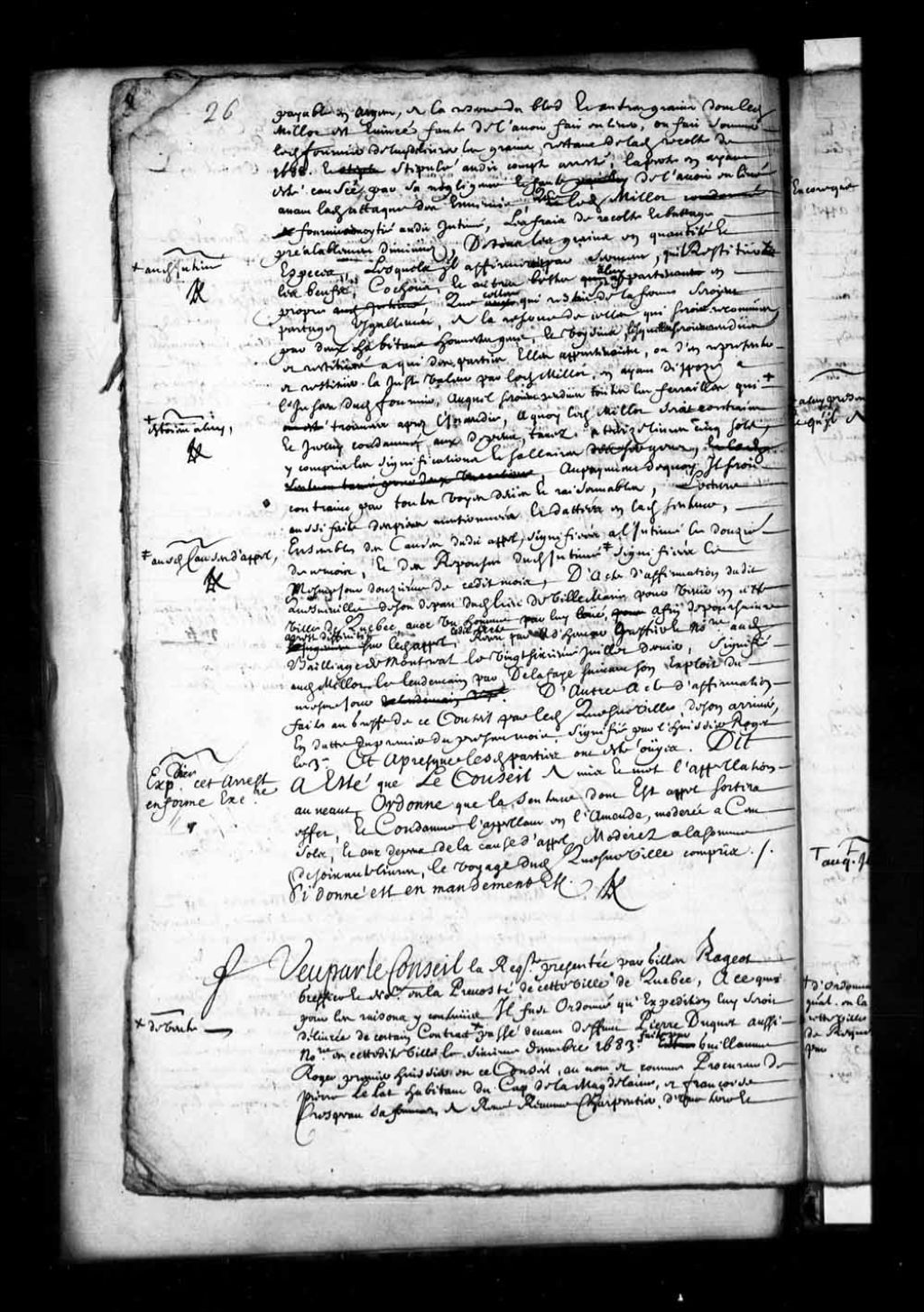 - Transcription du texte avec orthographe modernisée : «Monsieur de Villeray s'est retiré. Monsieur Dupont a présidé. Entre demoiselle Françoise DUQUET femme et procuratrice de Olivier Morel écuyer sieur de Ladurantaye, appelante de sentence de la prévôté de cette ville en date du onzième du présent mois, l'huissier Marandeau comparant pour elle d'une part, et Elisabeth GATINO servante de ladite demoiselle appelante, intimée, d'autre part. Parties ouïes, lecture faite de ladite sentence portant qu'avant faire droit l'intimée fera preuve, dans le lendemain, des mauvais traitements qu'elle prétend avoir reçus, et ordonnance dudit lieutenant général du neuvième de ce dit mois, au bas de requête de ladite demoiselle, par laquelle était ordonné que ladite Gastino se trouverait à l'audience le vendredi suivant pour être fait droit, si mieux elle n'aimait retourner au service de sa dite maîtresse jusqu'à ce qu'elle eût trouvé une autre servante, [...]