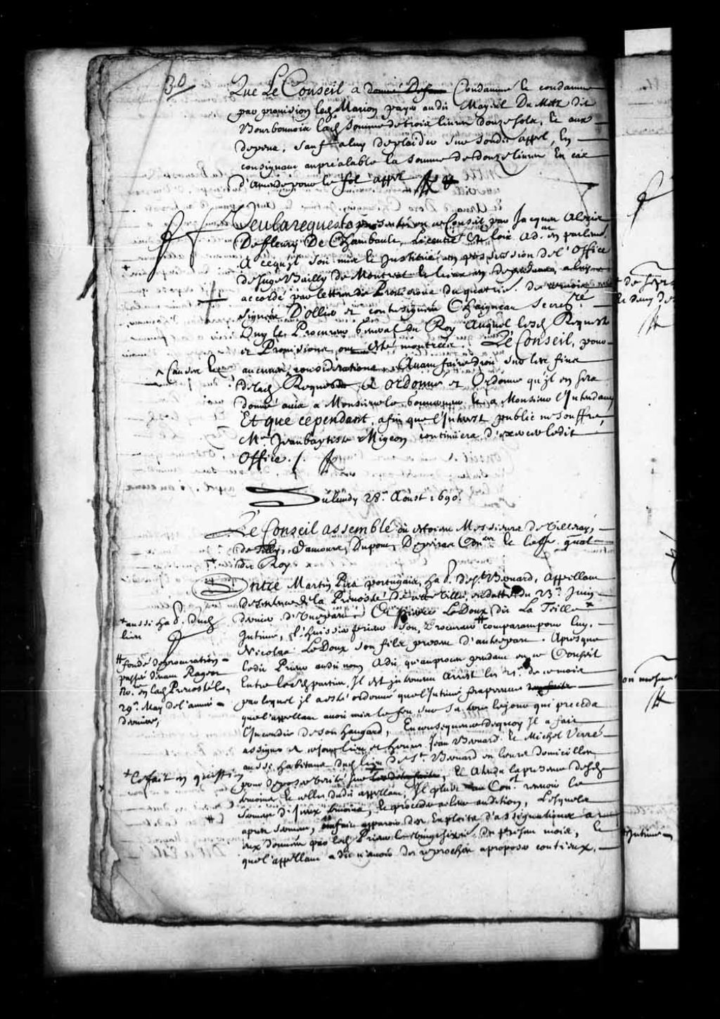 Ordre de communiquer au procureur et à l'Intendant la requête de Jacques-Alexis de Fleury sieur de Deschambault sollicitant l'office de juge bailli de Montréal, 21 août 1690, Archives nationales à Québec, Fonds Conseil souverain, (03Q,TP1,S28,P4442).
