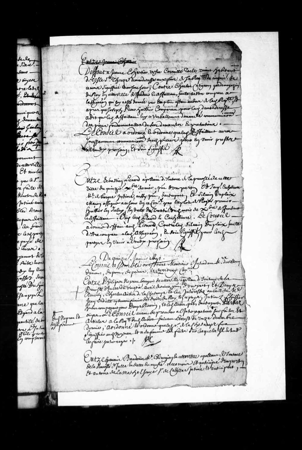 - Transcription du texte avec orthographe modernisée : «Entre Gervais BAUDOUIN maître chirurgien en cette ville, appelant de sentence de la prévôté d'icelle en date du neuvième de ce mois, et anticipé d'une part, et Antoine de LAMOTHE écuyer sieur de CADILLAC intimé et anticipant, d'autre part, lecture faite de ladite sentence, par laquelle l'appelant est condamné payer à l'intimé la somme de mille livres restant de celle de deux mille portée par contrat d'acquêts que l'intimé aurait fait de l'intimé d'un quart par indivis d'une maison et emplacement au bout d'icelle située en la basse-ville de Québec appartenant à demoiselle Marie Thérèse Guyon femme dudit sieur Cadillac en confirmant par Michel Guyon de Rouvray le cautionnement porté par ledit contrat, et au surplus ordonné que l'intimé délivrera audit appelant les titres concernant la demande, et icelui appelant aux dépens. Lecture aussi faite dudit contrat d'acquêts mentionné et daté en ladite sentence. Parties ouïes ledit Baudouin ayant dit que ledit Michel Guyon serait bonne caution si sa femme s'obligeait aussi bien que lui qu'il ne trouve pas solvable pour toute la somme pour laquelle il a acquis ledit quart de maison et emplacement. Le Conseil a mis et met l'appellation au néant, ordonne que la sentence dont est appel sortira effet, de grâce sans amende, et ci a condamné ledit appelant aux dépens, tant de la cause principale que de l'appel. BOCHART CHAMPIGNY.»