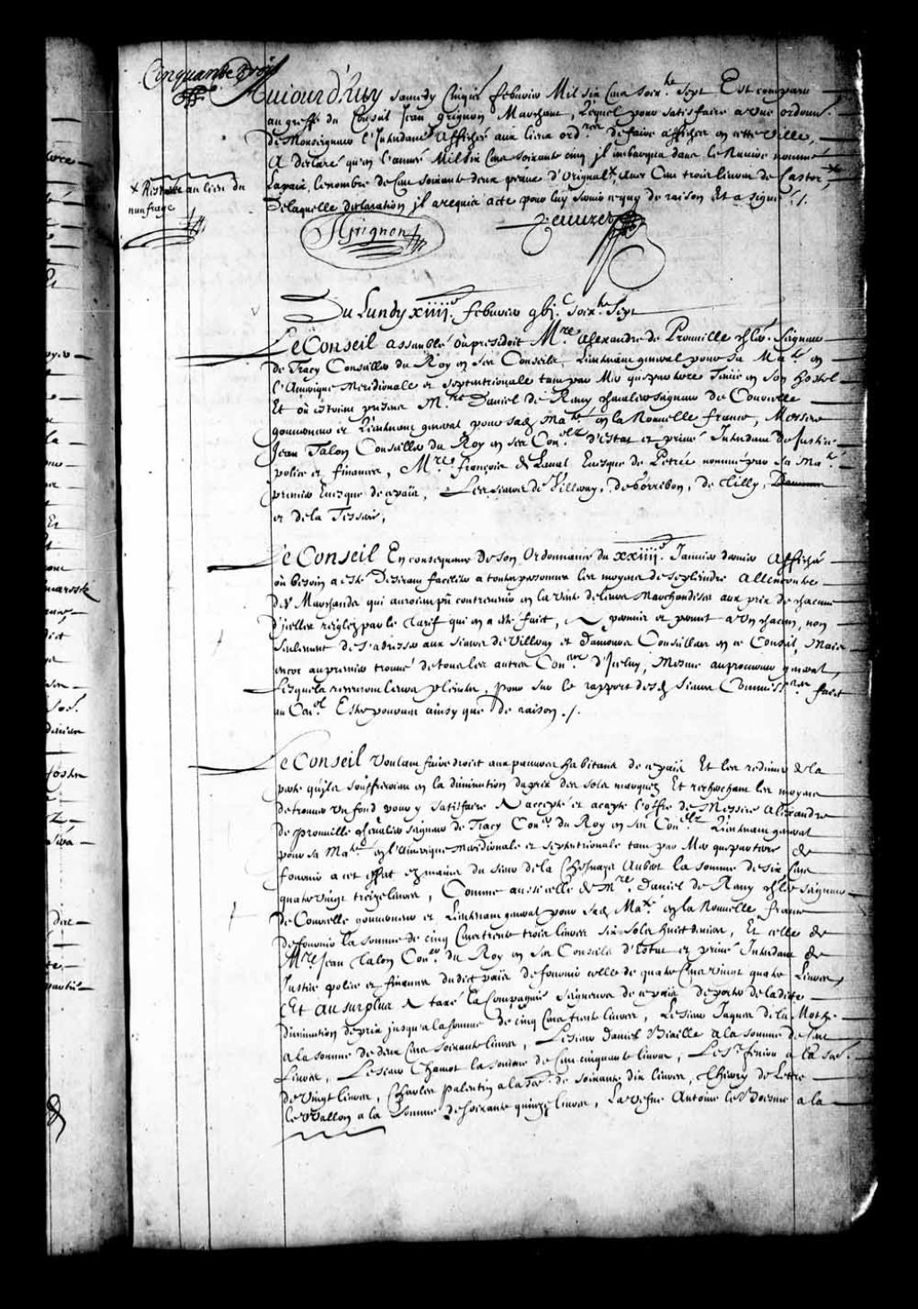 Transcription du texte avec orthographe modernisée : «Du lundi 14e février mille six cent soixante-sept. Le Conseil assemblé ou présidait messire Alexandre de Prouville chevalier seigneur de Tracy conseiller du Roi en ses Conseils lieutenant général pour sa Majesté en l'Amérique méridionale et septentrionale tant par mer que par terre tenue en son hôtel et où étaient présents messire Daniel de Rémy chevalier seigneur de Courcelle gouverneur et lieutenant général pour sa dite Majesté en la Nouvelle-France messire Jean Talon conseiller du Roi en ses Conseils d'état et privé intendant de justice police et finances messire François de Laval évêque de Petrée nommé par sa Majesté premier évêque de ce pays les sieurs de Villeray de Gorribon, de Tilly et de la Tesserie. Le Conseil en conséquence de son ordonnance du 24e janvier dernier affichée ou besoin a été désirant faciliter à toutes personnes les moyens de se plaindre à l'encontre des [...]