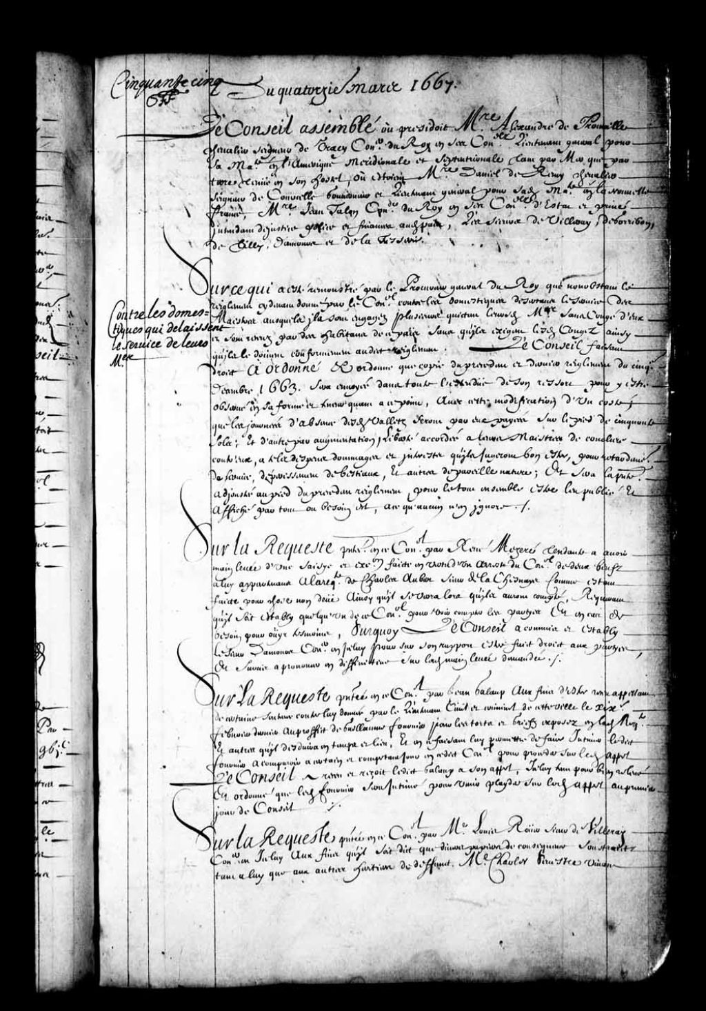 - Transcription du texte avec orthographe modernisée : «Du quatorzième mars 1667. Le Conseil assemblé où présidait messire Alexandre de Prouville chevalier seigneur de Tracy conseiller du Roi en ses Conseils lieutenant général pour sa Majesté en l'Amérique méridionale et septentrionale tant par mer que par terre tenue en son hôtel, où était messire Daniel de Rémy chevalier seigneur de Courcelle gouverneur et lieutenant général pour sa dite Majesté en la Nouvelle-France messire Jean Talon conseiller du Roi en ses Conseils d'état et privé intendant de justice police et finances audit pays les sieurs de Villeray, de Gorribon, de Tilly, Damours et de la Tesserie. Contre les domestiques qui délaissent le service de leurs maîtres. Sur ce qui a été remontré par le procureur général du Roi que nonobstant le règlement ci-devant donné par le Conseil contre les domestiques désertant le service des maîtres auxquels ils sont engagés plusieurs quittent leursdits maîtres sans congé d'eux et sont retirés par des habitants de ce pays sans qu'ils exigent lesdits congés ainsi qu'ils le doivent conformément audit règlement, le Conseil faisant droit a ordonné et ordonne que copie du précédent et dernier règlement du cinquième décembre 1663 sera envoyée dans toute l'étendue de son ressort pour y être observé en sa forme et teneur quant à ce point avec cette modification d'un côté que les journées d'absence desdits valets seront par eux payées sur le pied de cinquante sols et d'autre par augmentation liberté accordée à leurs maîtres de conclure contre eux à tels dépens dommages et intérêts qu'ils jugeront bon être pour retardement de service dépérissement de bestiaux et autres de pareille nature et sera la présente ajoutée au pied du précédent règlement pour le tout ensemble être lu publié et affiché par tout ou besoin est à ce qu'aucun n'en ignore.»
