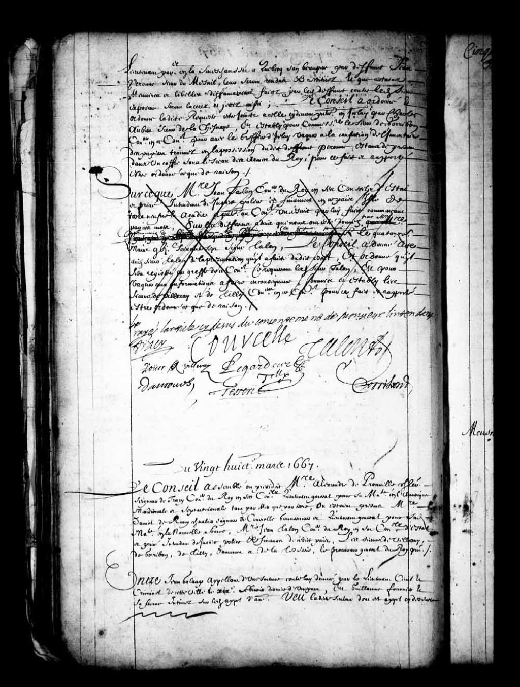 Transcription du texte avec orthographe modernisée : «Sur ce que messire Jean Talon conseiller du Roi en ses Conseils d'état et privé intendant de justice police et finances en ce pays, île de Terre-Neuve et Acadie a présenté au Conseil un écrit par lui fait commençant par ces mots, sur les différent avis qui nous ont été donnés le quatorzième mars mille six cent soixante-sept signé Talon. Le Conseil a donné acte audit sieur Talon de la présentation qu'il a faite dudit écrit et ordonné qu'il sera registré au greffe de ce Conseil ce requérant ledit sieur Talon, et pour vaquer aux informations à faire en conséquence commis et établi les sieurs de Villeray et de Tilly conseillers en ce Conseil pour ce fait et rapporté être ordonné ce que de raison. Rayé l'article ci-dessus du consentement de Monsieur l'intendant. TRACY COURCELLE, TALON ROUER DE VILLERAY, LEGARDEUR DE TILLY DAMOURS, TESSERIE GORRIBON.»