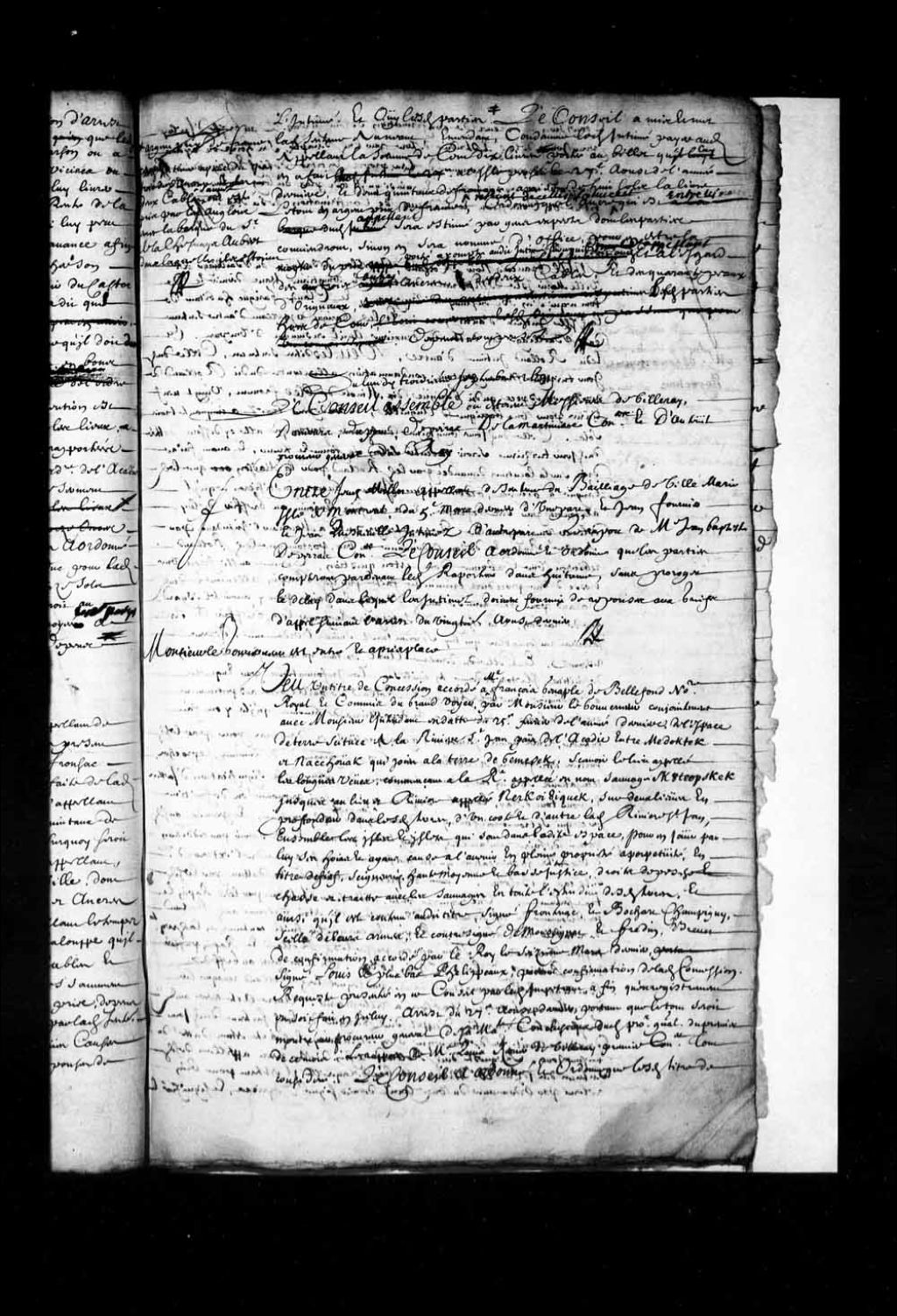 - Transcription du texte avec orthographe modernisée : «Monsieur le gouverneur est entré et a pris place. Vu un titre de concession accordé à maître François Genaple de Bellefond, notaire royal et commis du grand voyer, par Monsieur le gouverneur conjointement avec Monsieur l'intendant en date du vingt-cinq février de l'année dernière, de l'espace de terre située à la Rivière Saint-Jean pays de l'Acadie entre Medoctec (Medoktek) et Nacchouak (Nashouat, Nacchouak) qui joint à la terre de Jemesek (Gemesek, Jemseg, Jemsek, Gemsek, Gemesik), savoir le lieu appelé les longues vues, commençant à la Rivière appelée en nom sauvage Skouteopskok, jusqu'au lieu et Rivière appelée Nerkoiouiquek sur deux lieues en profondeur dans lesdites terres, d'un côté et d'autre ladite Rivière Saint-Jean, ensemble les îles et îlets qui sont dans ladite espace, pour en jouir par lui ses hoirs et ayant cause à l'avenir en pleine propriété a perpétuité en titre de [...]