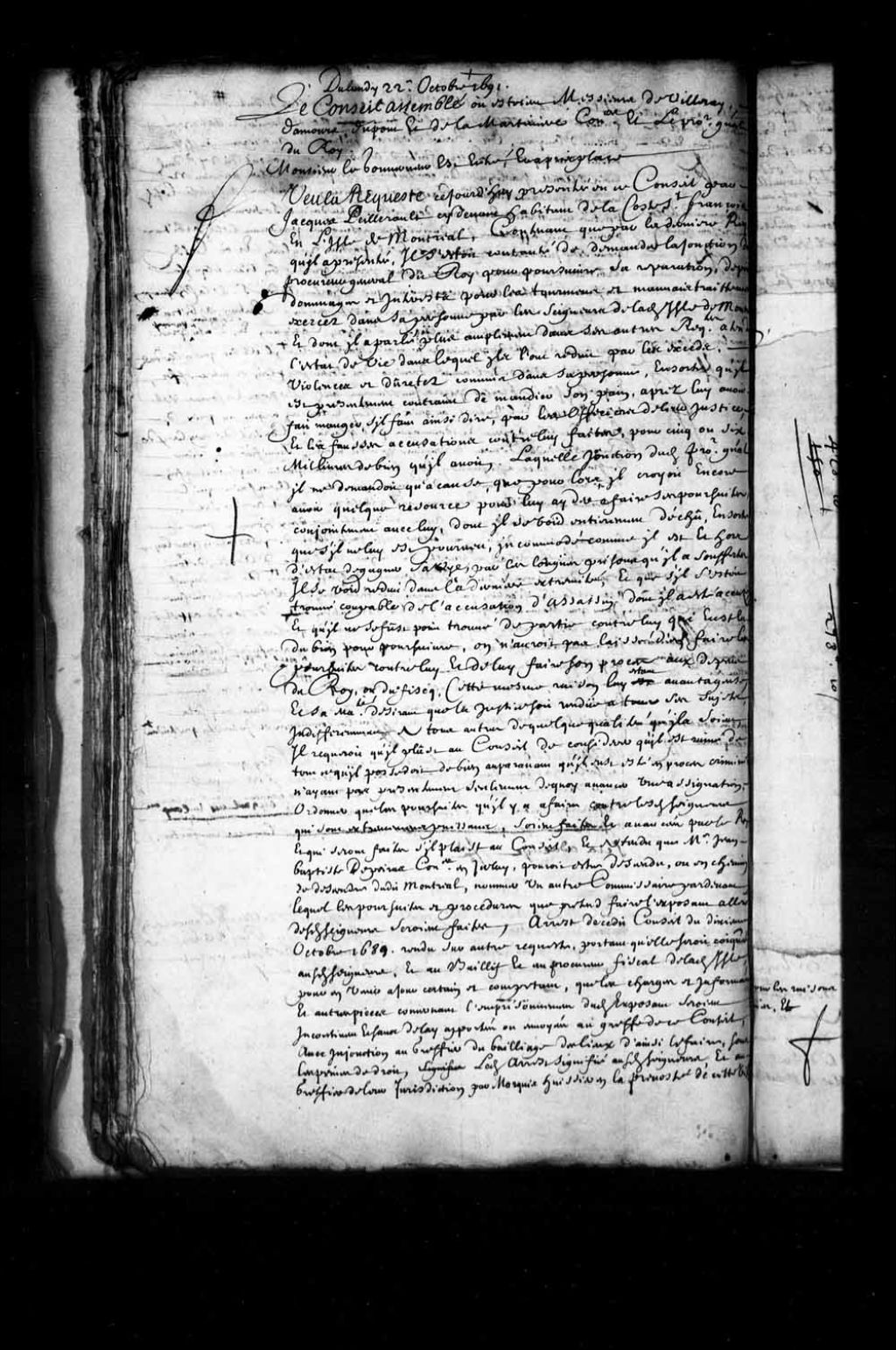 - Transcription du texte avec orthographe modernisée : «Du lundi vingt-deux octobre 1691. Le Conseil assemblé Idem. Monsieur le gouverneur est entré et a pris place. Vu la requête ce jourd'hui présentée en ce Conseil par Jacques Peillerault (Pillereau) ci-devant habitant de la côte Saint-François en l'île de Montréal, contenant que par la dernière requête qu'il a présentée il s'était contenté de demander la jonction du procureur général du Roi pour poursuivre sa réparation, dépens, dommages et intérêts pour les tourments et mauvais traitements exercés dans sa personne par les seigneurs de ladite île de Montréal, et dont il a parlé plus amplement dans ses autres requêtes attendu l'état de vie dans lequel Ils l'ont réduit par les excès violences et duretés commis dans sa personne en sorte qu'il est présentement contraint de mendier son pain après lui avoir fait manger s'il faut ainsi dire par les officiers de leur justice, et les fausses [...]