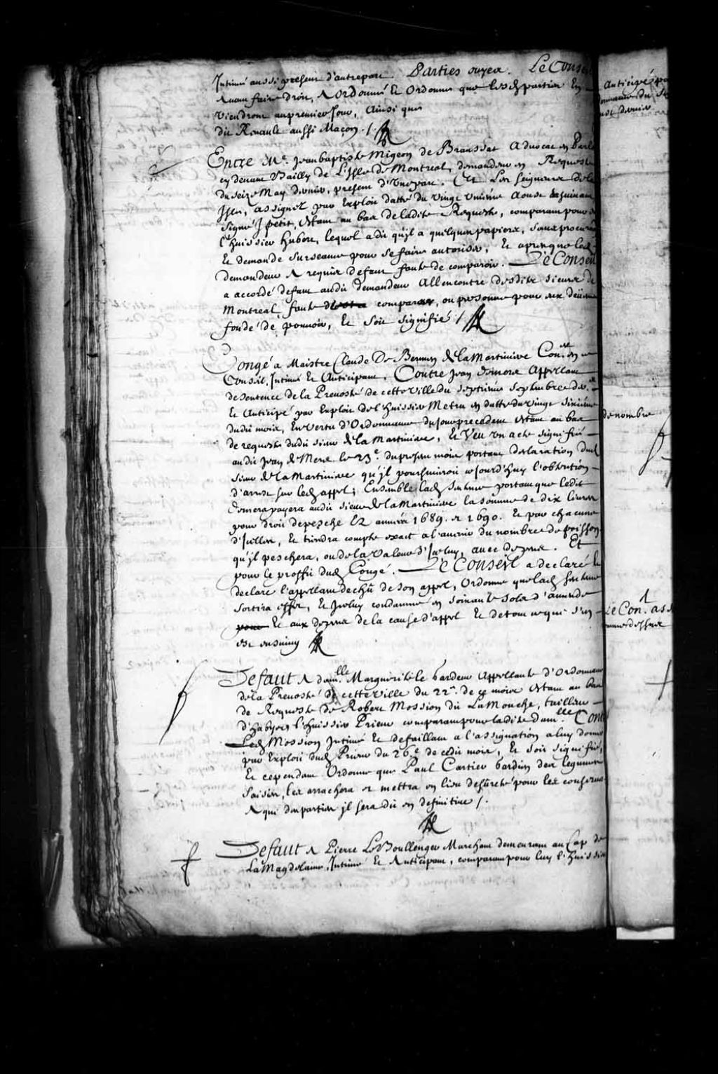 Transcription du texte avec orthographe modernisée : «Défaut à demoiselle Marguerite LeGardeur appelante d'ordonnance de la prévôté de cette ville du vingt-deuxième de ce mois étant au bas de requête de Robert Mossion dit Lamouche tailleur d'habits, l'huissier Prieur comparant pour ladite demoiselle, contre ledit Mossion intimé et défaillant à l'assignation à lui donnée par exploit dudit Prieur le vingt-sixième de ce dit mois, et soit signifié, et cependant ordonne que Paul Cartier gardien des légumes saisies les arrachera et mettra en lieu de sûreté pour les conserver à qui des parties il sera dit en définitive. ROUER DE VILLERAY.»