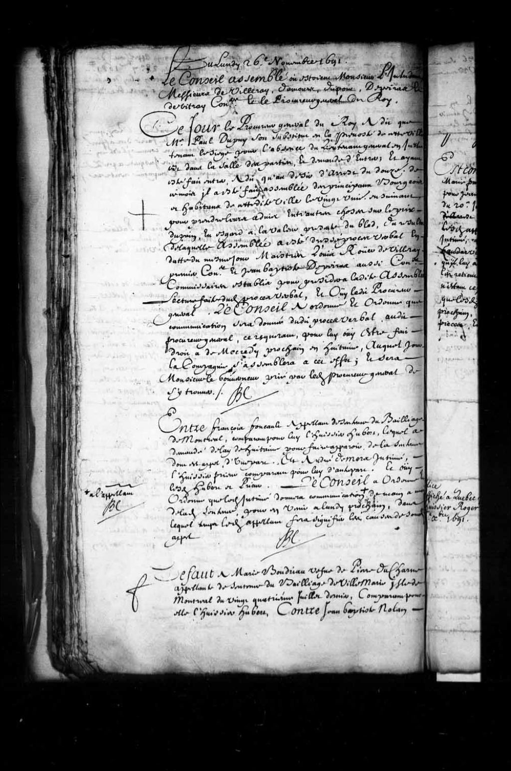 Communication par André Demers à François Foucault, appelant de sentence du Bailliage de Montréal, de la sentence en appel, 26 novembre 1691, Archives nationales à Québec, Fonds Conseil souverain, (03Q,TP1,S28,P4608).