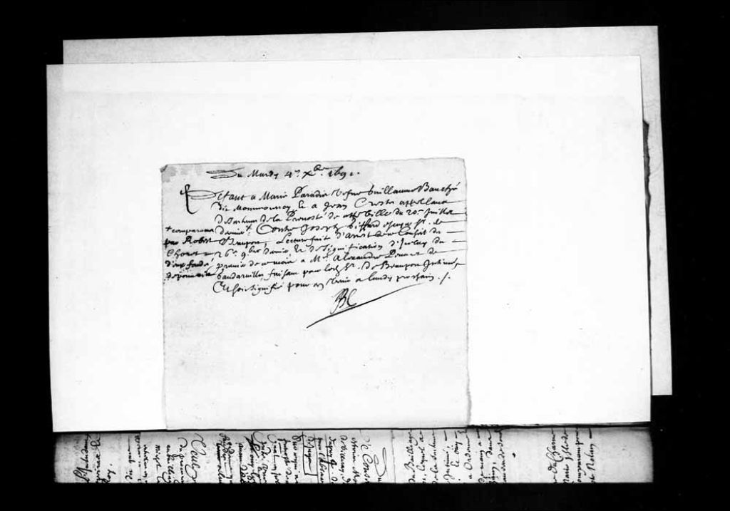 Défaut à Marie Paradis, veuve de Guillaume Baucher dit Montmorency (Morency), et Jean Crête (Creste), comparant par Robert Chauret (Choret), contre Joseph Giffard, écuyer et sieur de Beauport, 4 décembre 1691, Archives nationales à Québec, Fonds Conseil souverain, (03Q,TP1,S28,P4611).