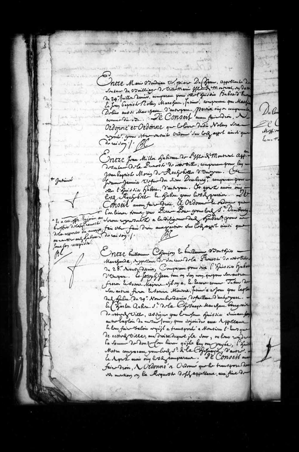 Transcription du texte avec orthographe modernisée : «Entre Jean MILLOT (Milot) habitant de l'île de Montréal appelant de sentence de la prévôté de cette ville, comparant pour lui Jean-Baptiste Morin de Rochebelle, d'une part, et Jeanne JANNIER veuve du sieur Dombourg, intimée, comparant pour elle l'huissier Hubert, d'autre part, et après avoir ouï lesdits Rochebelle et Hubert pour lesdites parties. Le Conseil avant faire droit a ordonné et ordonne que les livres tenus par Pierre Peiré pour ledit sieur Dombourg seront représentés à la diligence dudit Hubert, et à cet effet enjoint au greffier de ladite prévôté de les apporter ou envoyer ou remettre audit Hubert sous son récépissé, pour ce fait être fait droit aux parties sur ledit appel ainsi que de raison. BOCHART CHAMPIGNY.»