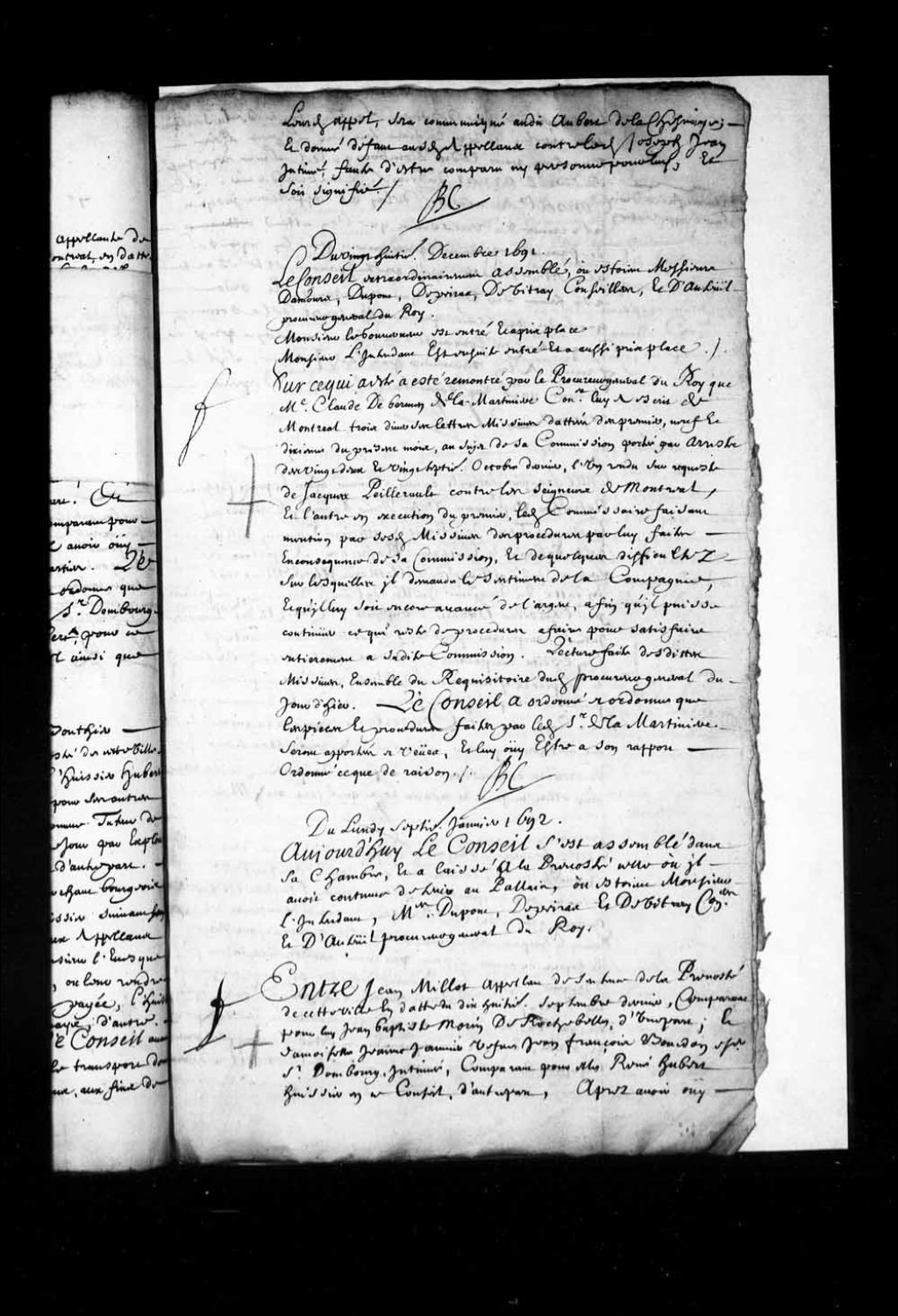 Transcription du texte avec orthographe modernisée : «Du lundi septième janvier mille six cent quatre-vingt-douze. Aujourd'hui, le Conseil s'est assemblé dans sa chambre, et a laissé à la prévôté celle où il avait coutume de tenir au palais, où étaient Monsieur l'intendant Maîtres Nicolas Dupont de Neuville. Jean-Baptiste Depeiras. Charles Denys de Vitré conseillers. Et François Madeleine Ruette d'Auteuil procureur général du Roi. »