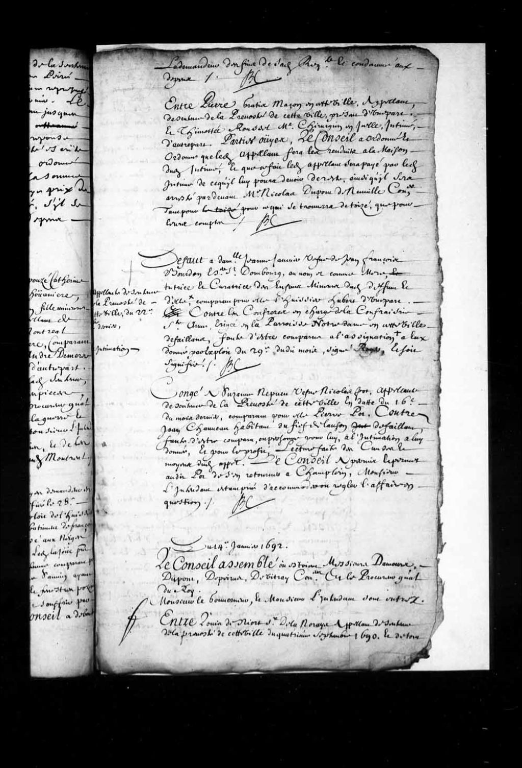 Transcription du texte avec orthographe modernisée : «Défaut à demoiselle Jeanne Jannier veuve de Jean François Bourdon écuyer sieur Dombourg, au nom et comme mère tutrice et curatrice des enfants mineurs dudit défunt et d'elle, appelante de sentence de la prévôté de cette ville du vingt-deuxième décembre dernier, comparant pour l'huissier Hubert d'une part, contre les confrères en charge de la confrérie Sainte-Anne érigée en la paroisse Notre-Dame en cette ville, défaillant faute d'être comparus à l'assignation et intimation à eux donnée par exploit du vingt-neuf dudit mois, signé Roger, et soit signifiée. BOCHART CHAMPIGNY.»