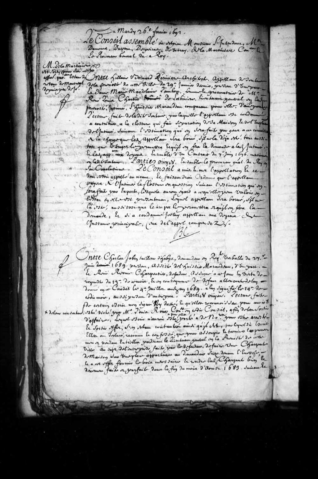 - Transcription du texte avec orthographe modernisée : «Du vingt-sixième février 1692. Le Conseil assemblé où étaient Monsieur l'intendant Maîtres Mathieu Damours, Dechaufour. Nicolas Dupont de Neuville. Jean-Baptiste Depeiras. Charles Denys de Vitré. Claude de Bermen de la Martinière conseillers. Et François Madeleine Ruette d'Auteuil procureur général du Roi. Monsieur de la Martinière est sorti pour ses affaires particulières étant de retour de Montréal, depuis peu de jours. Entre Hilaire BERNARD LARIVIERE architecte appelant de sentence de la prévôté de cette ville du vingt-neuf janvier dernier, présent, d'une part, et dame Marie Madeleine LAMBERT femme et procuratrice de maître René Louis Chartier de Lotbinière lieutenant général en ladite prévôté, intimée, l'huissier Marandeau comparant pour elle d'autre part. Lecture faite de ladite sentence par laquelle l'appelant est condamné de contribuer à la clôture qui fait séparation de sa [...]