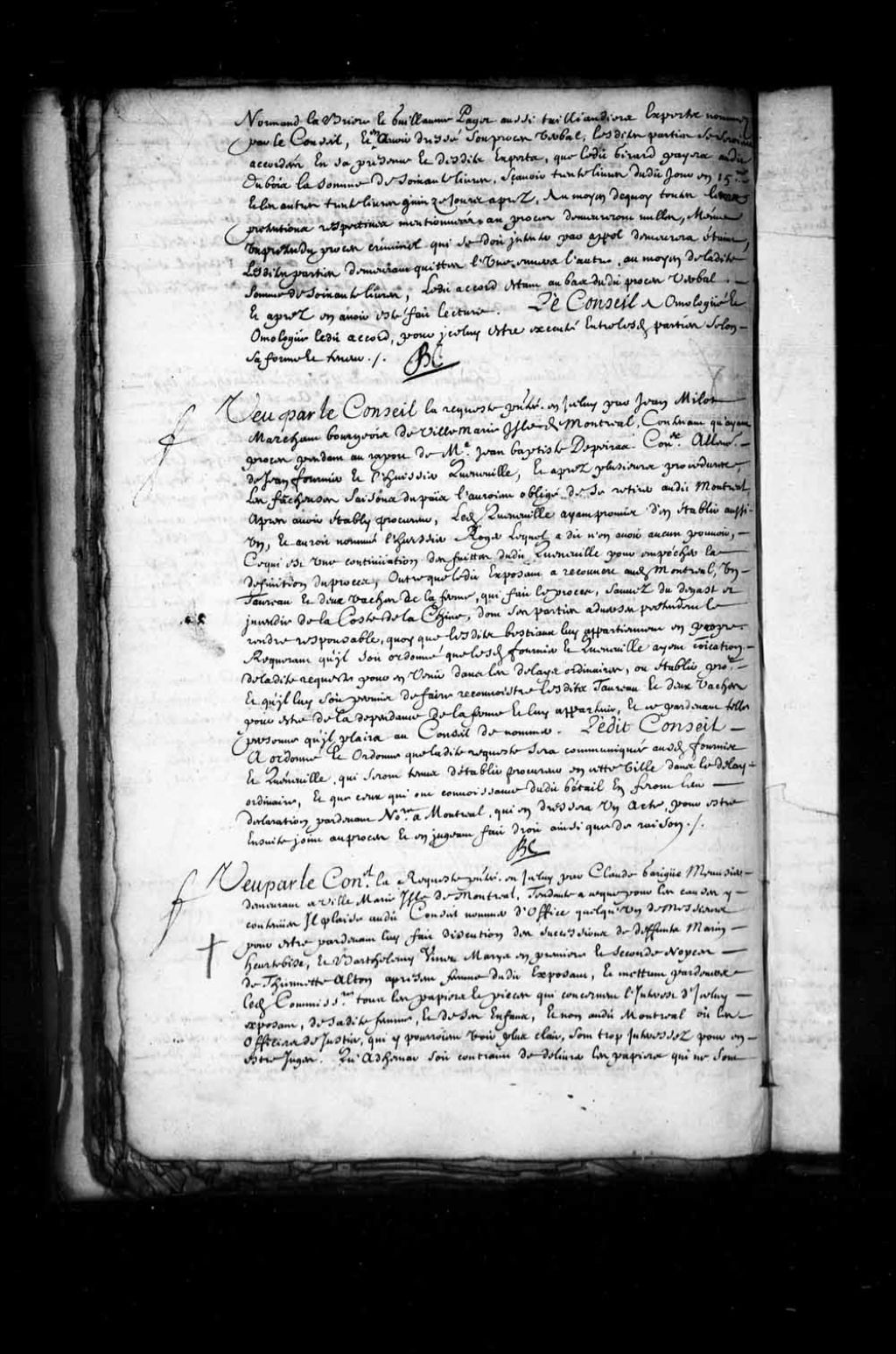 - Transcription du texte avec orthographe modernisée : «Vu par le Conseil la requête présentée en icelui par Jean Millot (Milot) marchand bourgeois de Ville-Marie île de Montréal, contenant qu'ayant procès pendant au rapport de maître Jean-Baptiste Depeiras conseiller à l'encontre de Jean Fournier et l'huissier Quesneville (Quenneville) et après plusieurs procédures les fâcheuses saisons du pays l'auraient obligé de se retirer audit Montréal après avoir établi procureur, ledit Quesneville ayant promis d'en établir aussi un et aurait nommé l'huissier Roger lequel a dit n'en avoir aucun pouvoir ce qui est une continuation de fuites dudit Quesneville pour empêcher la définition du procès, outre que ledit exposant a recouvert audit Montréal un taureau et deux vaches de la ferme, qui fait le procès, sauvés du dégât et incendie de la côte de Lachine dont ses parties adverses prétendent le rendre responsable quoi que lesdits bestiaux lui [...]