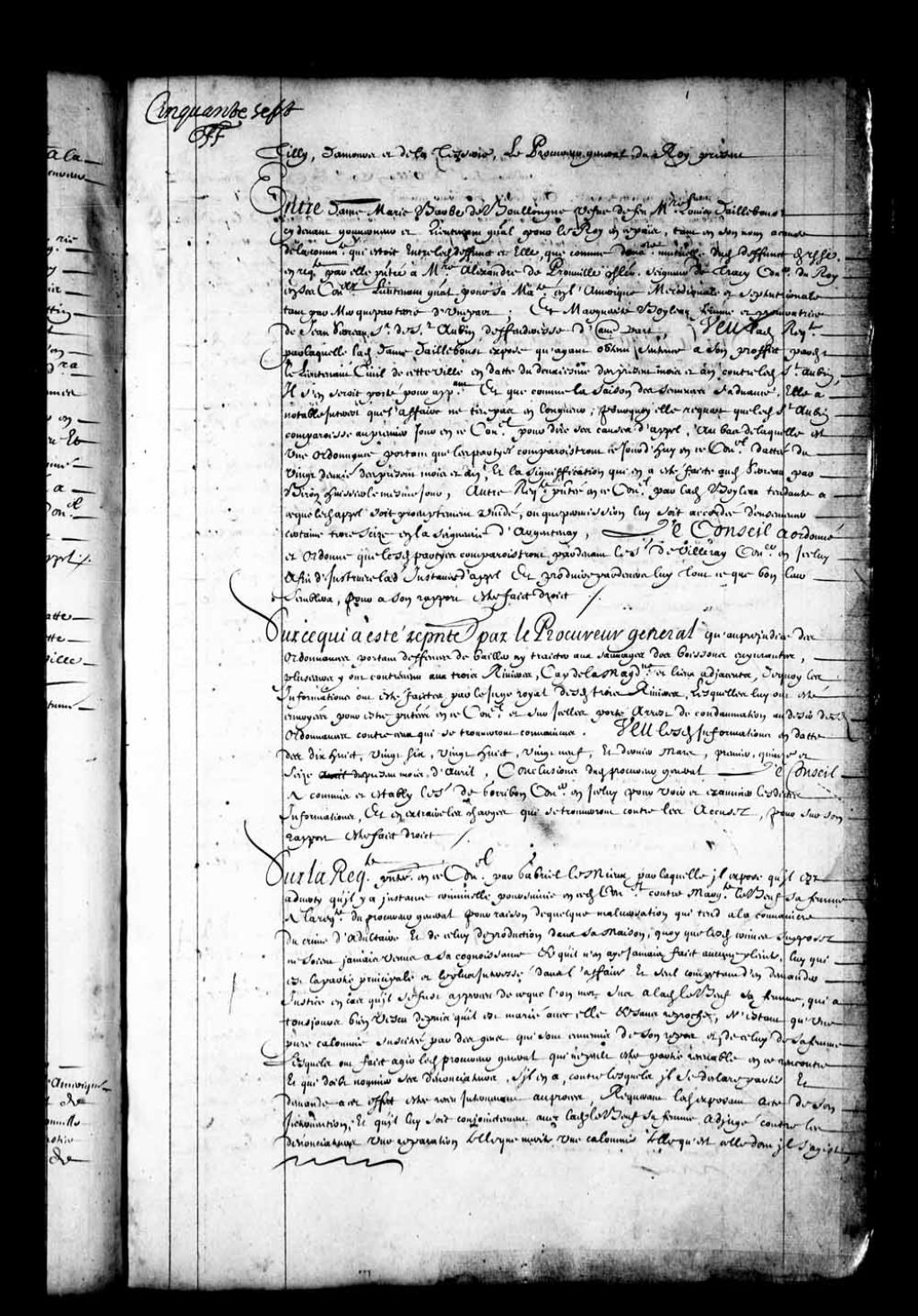 - Transcription du texte avec orthographe modernisée : «Sur la requête présentée en ce Conseil par Gabriel Lemieux par laquelle il expose qu'il est averti qu'il y a instance criminelle poursuivie en ce dit Conseil contre Marguerite LeBeuf sa femme à la requête du procureur général pour raison de quelque malversation qui tend à la convaincre du crime d'adultère et de celui de production dans sa maison quoi que lesdits crimes supposés ne soient jamais venus à sa connaissance et qu'il n'en aie jamais faits aucune plainte lui qui est la partie principale et le plus intéressé dans l'affaire et seul compétent d'en demander justice en cas qu'il se fut aperçu de ce que l'on met sus à ladite LeBeuf sa femme qui a toujours bien vécu depuis qu'il est marié avec elle et sans reproche n'étant qu'une pure calomnie suscitée par des gens qui sont ennemis de son repos et de celui de sa femme lesquels ont fait agir ledit procureur général qui ne peut-être partie recevable en ce rencontre et qui doit nommer ses dénonciateurs s'il en a contre lesquels il se déclare partie et demande à cet effet être reçu intervenant au procès, requérant ledit exposant acte de son intervention et qu'il lui soit conjointement avec ladite LeBeuf sa femme adjugé contre les dénonciateurs une réparation telle que mérite une calomnie telle qu'est celle dont il s'agît vu les informations faites contre ladite LeBeuf les (...) par-devant le sieur de Villeray conseiller en ce Conseil commissaire de par icelui en cette partie ouï ledit procureur général, le Conseil a ordonné et ordonne que les informations encommencées seront continuées à raison de la production qu'a ladite LeBeuf la réputation de faire de femme et de filles pour commettre le crime d'impudicité laissant celui d'adultère à décider entre le mari et la femme pour lesdites informations faites et parfaites être an rapport dudit sieur de Villeray fait tel droit que de raison.»