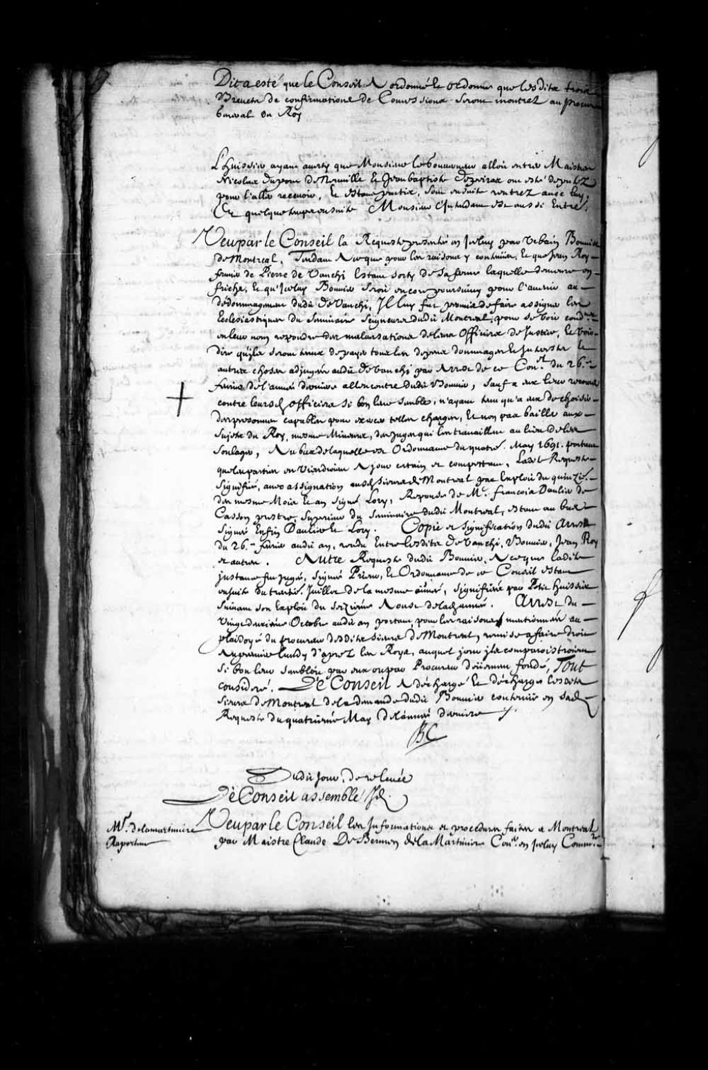 - Transcription du texte avec orthographe modernisée : «Dudit jour de relevée. Le Conseil assemblé Idem. Vu par le Conseil les informations et procédures faites à Montréal par maître Claude de Bermen de la Martinière conseiller en icelui commissaire en cette partie à la requête de Jacques Peillerault (Pillereau), le procureur général joint, en conséquence d'arrêt du vingt-deux octobre dernier, à l'encontre de seigneurs de l'île de Montréal et leur juge et procureur fiscal au bailliage de Ville-Marie, les réponses et significations faites tant audit commissaire qu'à maître Claude Maugue substitut dudit procureur général à l'effet de la commission dudit sieur de La Martinière et audit Peillerault, à la requête de maître François Daulier de Casson supérieur du séminaire de Ville-Marie et procureur de maître Louis Tronson supérieur du séminaire de Saint-Sulpice à Paris, et à la requête de maître Etienne Guyotte curé de Ville-Marie et de maître François Seguenot curé de la paroisse de la Pointe aux Trembles dans ladite île, en date des 13, 18, 20, 22, et dernier décembre ensuivant, et deux et 12 janvier de la présente année contenant leurs exceptions déclinatoires et prise à partie à l'encontre desdits conseiller commissaire procureur général et son substitut audit Montréal, et autres dires et protestations, vu aussi la continuation d'information faite en cette ville de Québec par ledit commissaire suivant l'arrêt du quinzième du présent mois; ouï le rapport dudit sieur de La Martinière et ledit procureur général en son réquisitoire, le Conseil avant de passer outre et sans s'arrêter auxdits moyens d'exceptions déclinatoires, dires et protestations, a ordonné et ordonne que ledit sieur Dollier au nom qu'il procède et lesdits sieurs Guyotte et Seguenot (Séguenot) seront assignés chacun en droit soi, à comparaître en icelui à jour certain et compétent pour dire les raisons qu'ils prétendent avoir eues et avoir encore de prendre à partie ledit conseiller commissaire, et le procureur général, ensemble ses substituts au fait desdites procédures pour ce fait être ordonné ce qu'il appartiendra, et cependant lesdites informations et procédures seront remises par devers maître Louis Rouer de Villeray premier conseiller pour à son rapport être fait droit quand il appartiendra; donné est en mandement au premier huissier ou sergent sur ce requis faire tous exploits à ce requis et nécessaires sous les peines de droit. Monsieur de la Martinière rapporteur. BOCHART CHAMPIGNY.»