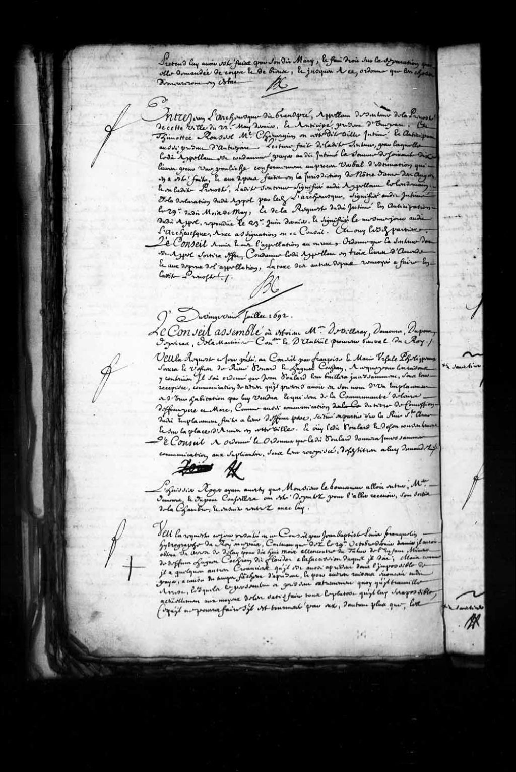 - Transcription du texte avec orthographe modernisée : «Entre Jean L'Archevêque (Larchevêque) dit GRANDPRÉ, appelant de sentence de la prévôté de cette ville du 22e mai dernier, et anticipé présent d'une part. Et Timothée ROUSSEL maître chirurgien en cette dite ville, intimé et anticipant, aussi présent d'autre part. Lecture faite de ladite sentence, par laquelle ledit appelant est condamné payer audit intimé la somme de soixante-dix livres pour une pouliche conformément au procès-verbal d'estimation qui en a été faite, et aux dépens faits en la juridiction de Notre-Dame-des-Anges et en ladite prévôté, ladite sentence signifiée audit appelant le lendemain. De la déclaration dudit appel par ledit L'Archevêque, signifiée audit intimé le 29e dudit mois de mai, et de la requête dudit intimé en anticipation dudit appel, répondue le 23e juin dernier, et signifiée le même jour audit L'Archevêque, avec assignation en ce Conseil et ouï lesdites parties. Le Conseil a mis et met l'appellation au néant, ordonne que la sentence dont est appel sortira effet, condamne ledit appelant en trois livres d'amende, et aux dépens de l'appellation, la taxe des autres dépens renvoyée à faire en ladite prévôté. BOCHART CHAMPIGNY.»