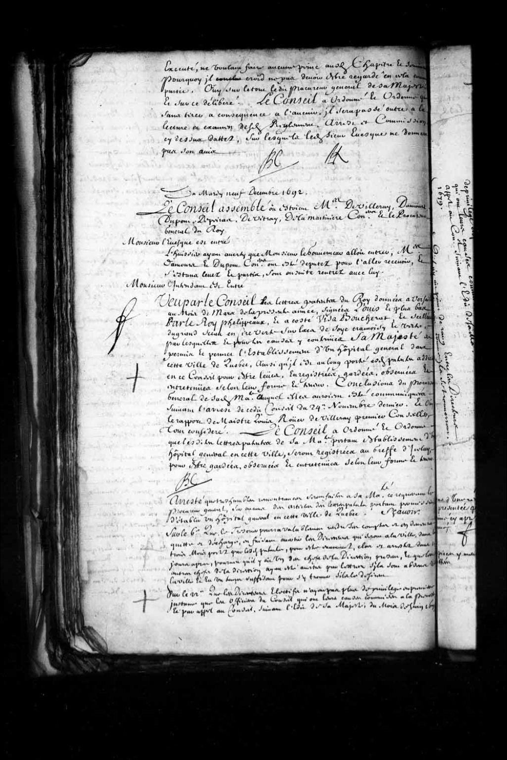 - Transcription du texte avec orthographe modernisée : «Arrêté que très humbles remontrances seront faites à sa Majesté ce requérant le procureur général, sur aucuns des articles des lettres patentes portant permission d'établir un Hôpital général en cette ville de Québec. Savoir sur le 6e que le trésorier pourra valablement rendre ses comptes et en demeurer quitte et déchargé, en faisant avertir les directeurs qui seront à la ville, dans les trois mois portés par lesdites patentes, pour être examinés, clos et arrêtés dans quinze jours après, pourvu qu'il y ait un des chefs de la direction présent, et que les autres chefs de la direction aient été avertis par lettres, s'ils sont absens de la ville et en un temps suffisant pour s'y trouver s'ils le désirent. Sur le 22e que les directeurs électifs n'aient pas plus de privilège en première instance que les officiers du Conseil qui ont leurs causes commises à la prévôté, et par appel au Conseil, suivant l'édit de sa Majesté du mois de juin 1679. Sur le 24e qu'il n'y ait point de rang entre les directeurs électifs; mais qu'ils se placeront comme ils se trouveront. BOCHART CHAMPIGNY.»