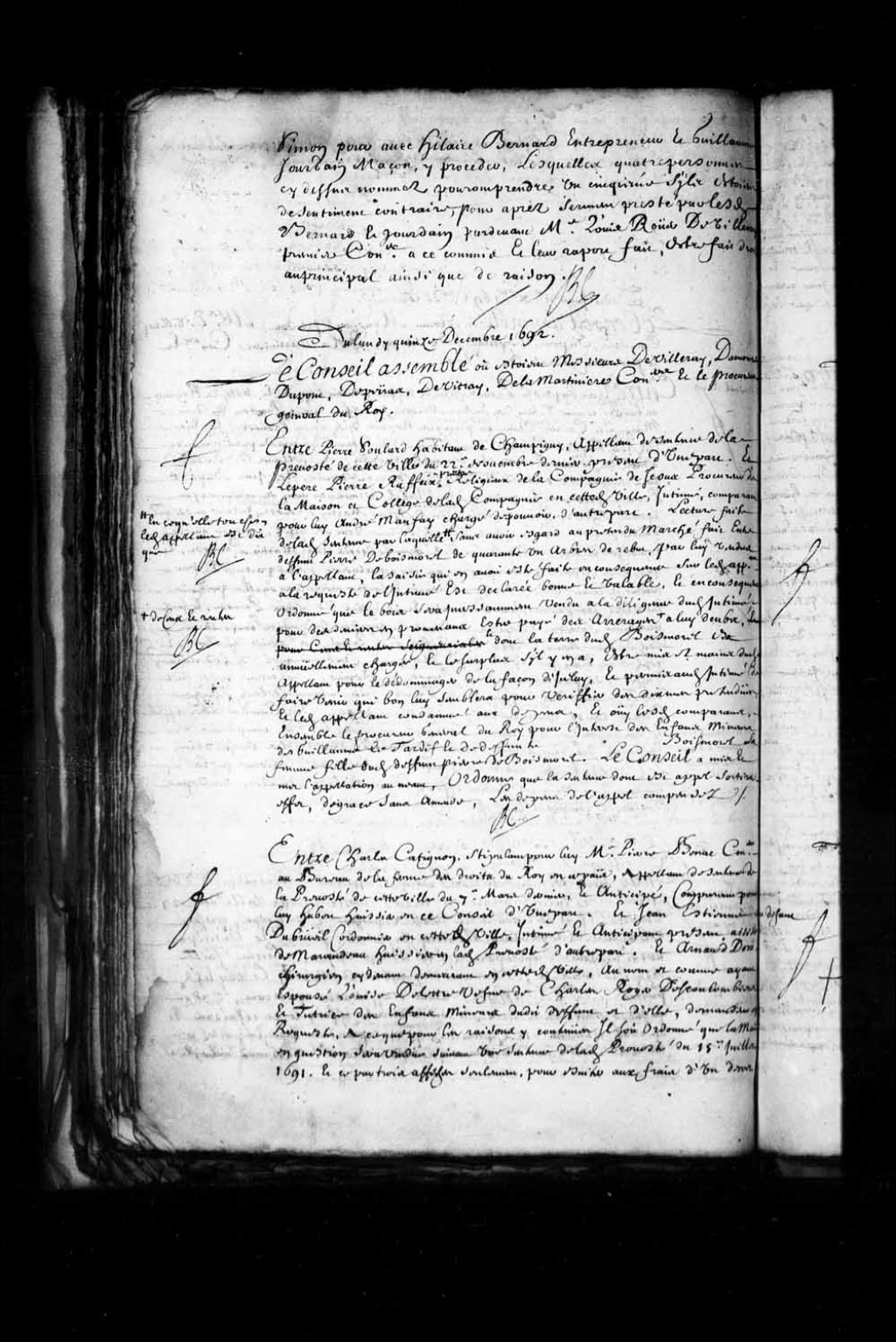 - Transcription du texte avec orthographe modernisée : «Du lundi 15e décembre 1692. Le Conseil assemblé où étaient Maîtres Louis Rouer de Villeray premier conseiller. Mathieu Damours Deschaufour. Nicolas Dupont de Neuville. Jean-Baptiste Depeiras. Charles Denys de Vitray. Claude de Bermen de la Martinière conseillers. Et François Madeleine Ruette d'Auteuil procureur général du Roi. Monsieur l'intendant est entré. Entre Pierre SOULARD habitant de Champigny, appelant de sentence de la prévôté de cette ville du 22e novembre dernier, présent d'une part. Et le père Pierre RAFEIX (Raffeix) prêtre religieux de la compagnie de Jésus procureur de la maison et collège de ladite compagnie en cette dite ville, intimé, comparant pour lui André Maufey chargé de pouvoir d'autre part. Lecture faite de ladite sentence par laquelle en ce qu'elle touche ledit appelant est dit que sans avoir égard au prétendu marché fait entre défunt Pierre de Boismorel de [...]