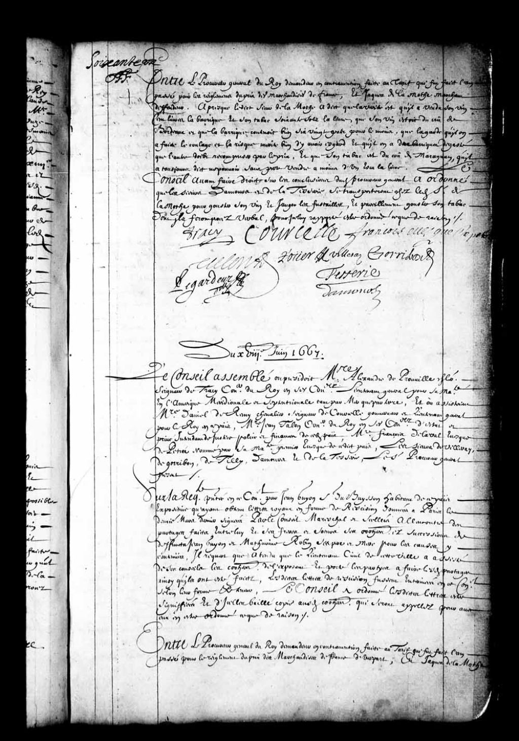 - Transcription du texte avec orthographe modernisée : «Entre le procureur général du Roi demandeur en contravention faite au tarif qui fut fait l'an passé pour les règlements du prix des marchandises de France et Jacques de Lamothe marchand défendeur. Après que ledit sieur de LaMothe a dit que la vérité est qu'il a vendu son vin cent livre la barrique et son tabac soixante sols la livre que son vin était du crû de Bordeaux et que la barrique contenait bien six vingt pots pour le moins que la garde qu'il en a faite le coulage et la risque mérite bien d'y avoir égard et qu'il en à deux barriques de gâté que l'autre doit récompenser par le prix. Et que son tabac est du crû de Maragnan qu'il a toujours dit ne pouvoir sans perte vendre à moins d'un écu la livre. Le Conseil avant faire droit sur les conclusions dudit procureur général a ordonné que les sieurs Damours et de la Tesserie se transporteront chez ledit sieur de LaMothe pour goûter son vin et jauger les futailles et pareillement goûter son tabac dont ils feront procès verbal pour icelui rapporté être ordonné ce que de raison. TRACY COURCELLE, TALON FRANÇOIS évêque de petrée, ROUER DE VILLERAY GORRIBON, LEGARDEUR DE TILLY DAMOURS TESSERIE.»