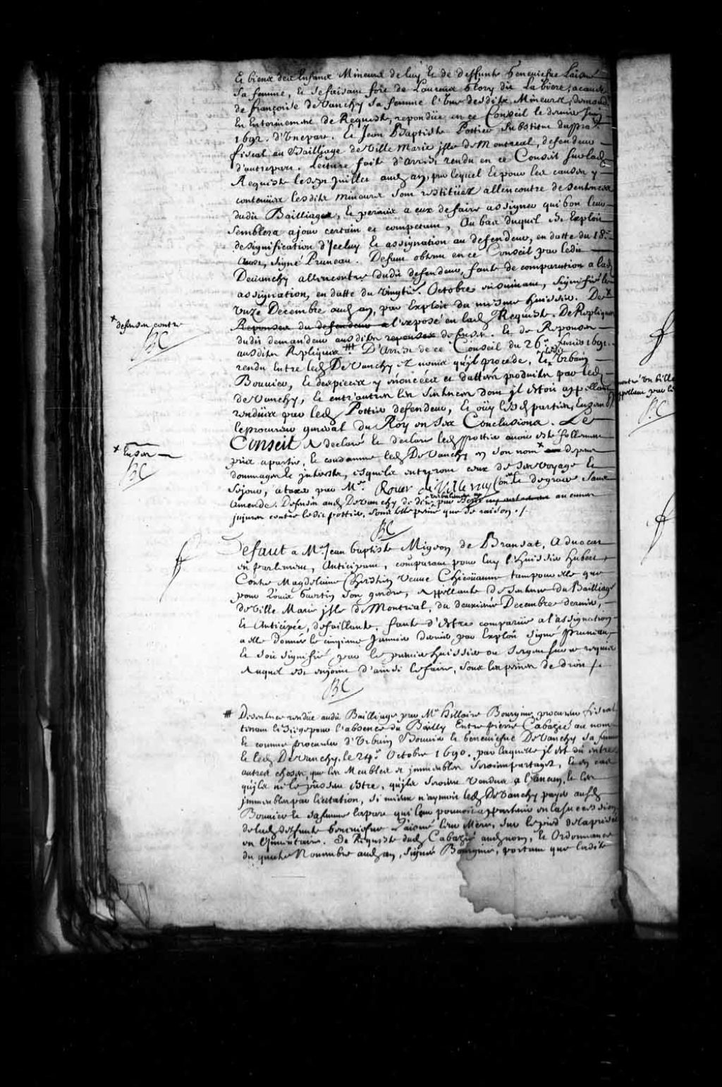 Défaut à Me Jean-Baptiste Migeon de Branssat, avocat au Parlement, contre Madeleine Chrétien, veuve de Pierre Chicoine, tant par elle que pour Louis Guertin, son gendre, faute d'être comparu à l'assignation donnée le 5 janvier 1693