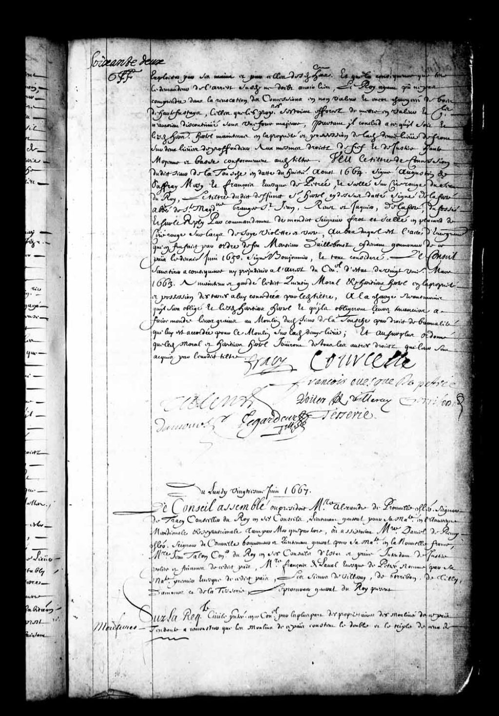 - Transcription du texte avec orthographe modernisée : «Du lundi vingtième juin 1667. Le Conseil assemblé où présidait messire Alexandre de Prouville chevalier seigneur de Tracy conseiller du Roi en ses Conseils, lieutenant général pour sa Majesté en l'Amérique méridionale et septentrionale tant par mer que par terre, où assistaient messire Daniel de Rémy chevalier seigneur de Courcelle gouverneur et lieutenant général pour sa Majesté en la Nouvelle-France, messire Jean Talon conseiller du Roi en ses Conseils d'état et privé intendant de justice police et finances de ce dit pays, messire François de Laval évêque de Petrée nommé par sa Majesté premier évêque de ce dit pays, les sieurs de Villeray, de Gorribon, de Tilly, Damours et de la Tesserie, le procureur du Roi présent. Moutures. Sur la requête civile présentée en ce Conseil par la plupart des propriétaires des moulins de ce pays tendante à remontrer que les moulins de ce pays coûtent [...]