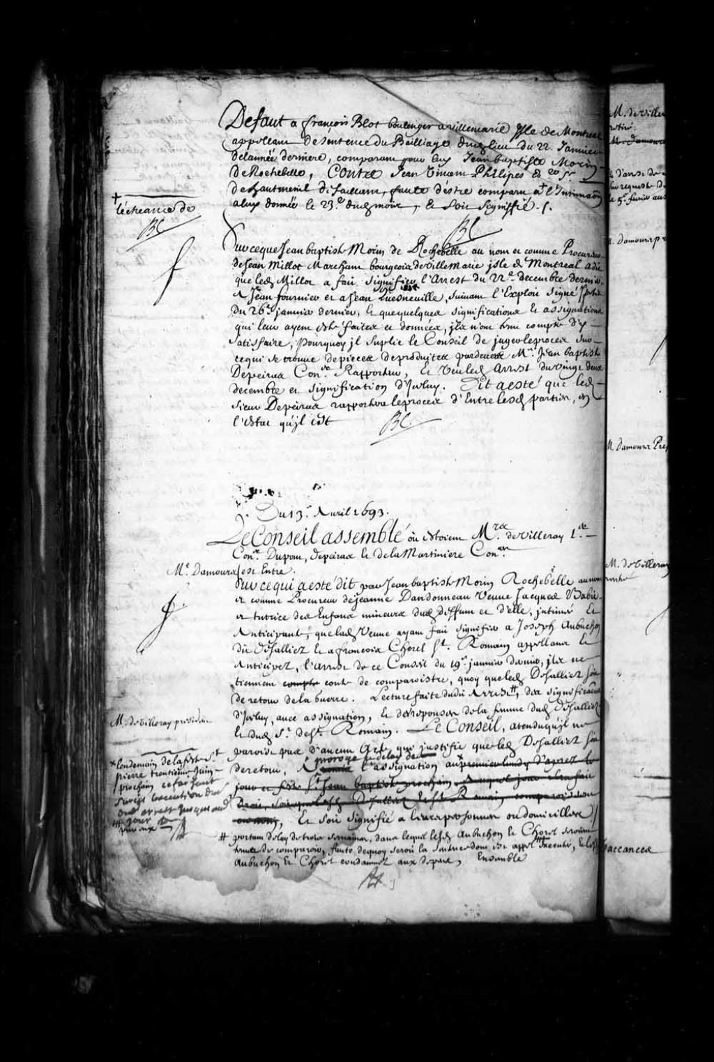 - Transcription du texte avec orthographe modernisée : «Du treizième avril 1693. Le Conseil assemblé où étaient Maîtres Louis Rouer de Villeray premier conseiller. Mathieu Damours Deschaufour Nicolas Dupont de Neuville. Jean-Baptiste Depeiras. Et Claude de Bermen de La Martinière conseillers. Sur ce qui a été dit par Jean-Baptiste Morin de Rochebelle, au nom et comme procureur de Jeanne Dandonneau veuve Jacques Babie et tutrice des enfants mineurs dudit défunt et d'elle, intimée et anticipante, que ladite veuve ayant fait signifier à Joseph Aubuchon dit Desalliés, et à François Chorel Saint-Romain, appelant et anticipés, l'arrêt de ce Conseil du 19e janvier dernier, ils ne tiennent compte de comparaître, quoi que ledit Desalliés soit de retour de la Guerre. Lecture faite dudit arrêt, portant délai de trois semaines, dans lequel lesdits Aubuchon et Chorel seraient tenus de comparaître, faute de quoi serait la sentence dont est appel par eux exécutée, et lesdits Aubuchon et Chorel condamnés aux dépens. des significations d'icelui, avec assignation, et des réponses de la femme dudit Desalliés et dudit de Saint-Romain. Le Conseil Attendu qu'il ne paraît pas d'aucun acte qui justifie que ledit Desalliés soit de retour, a prorogé le délai de l'assignation au lendemain de la fête Saint-Pierre trente juin prochain, ce faisant sursis l'exécution dudit arrêt jusqu'audit jour, et soit signifié à leurs personnes ou domiciles. ROUER DE VILLERAY.»