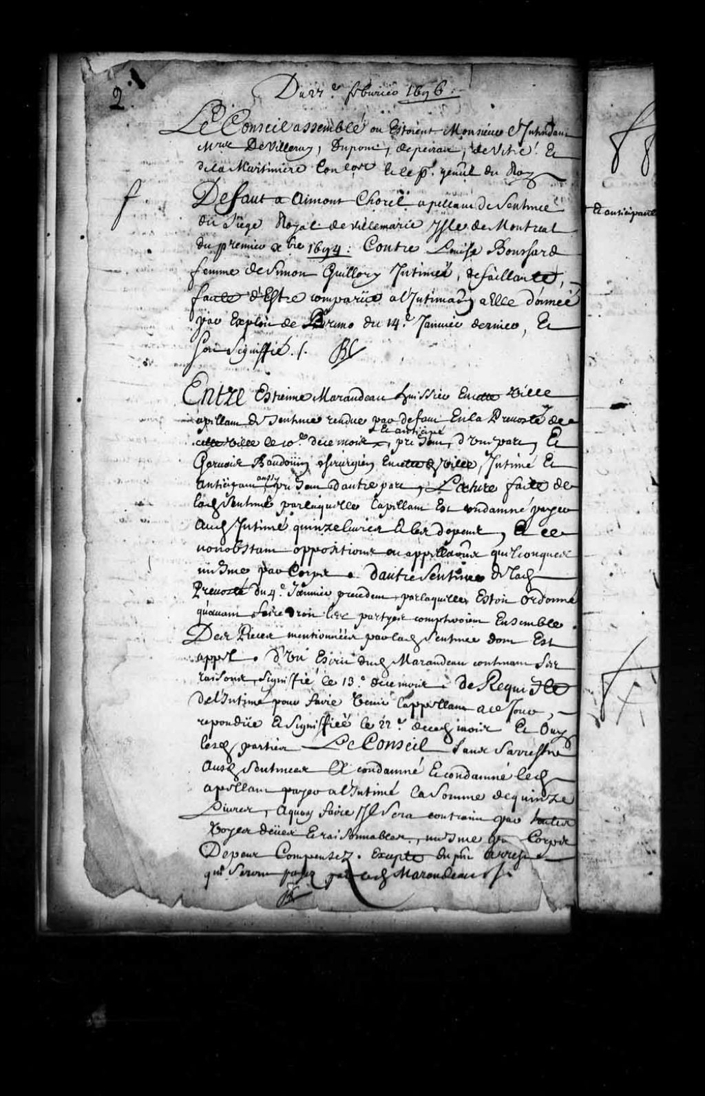 - Transcription du texte avec orthographe modernisée : «Du vingt-septième février mille six cent quatre-vingt-seize. Le Conseil assemblé où étaient Monsieur l'intendant, maîtres Louis Rouer de Villeray, premier conseiller, Nicolas Dupont de Neuville, Jean-Baptiste Depeiras, Charles Denys de Vitré, Claude de Bermen de la Martinière et Pierre Noël Legardeur conseillers et François Madeleine Ruette d'Auteuil procureur général du Roi. Entre Etienne MARANDEAU huissier en cette ville appelant de sentence rendue par défaut en la prévôté de cette ville du dixième de ce mois et anticipé présent d'une part, et Gervais BAUDOUIN chirurgien en cette dite ville, intimé et anticipant aussi présent d'autre part, lecture faite de ladite sentence par laquelle l'appelant est condamné payer audit intimé quinze livres et les dépens et ce nonobstant oppositions ou appellations quelconques, même par corps; d'autre sentence de ladite prévôté du quatre janvier [...]