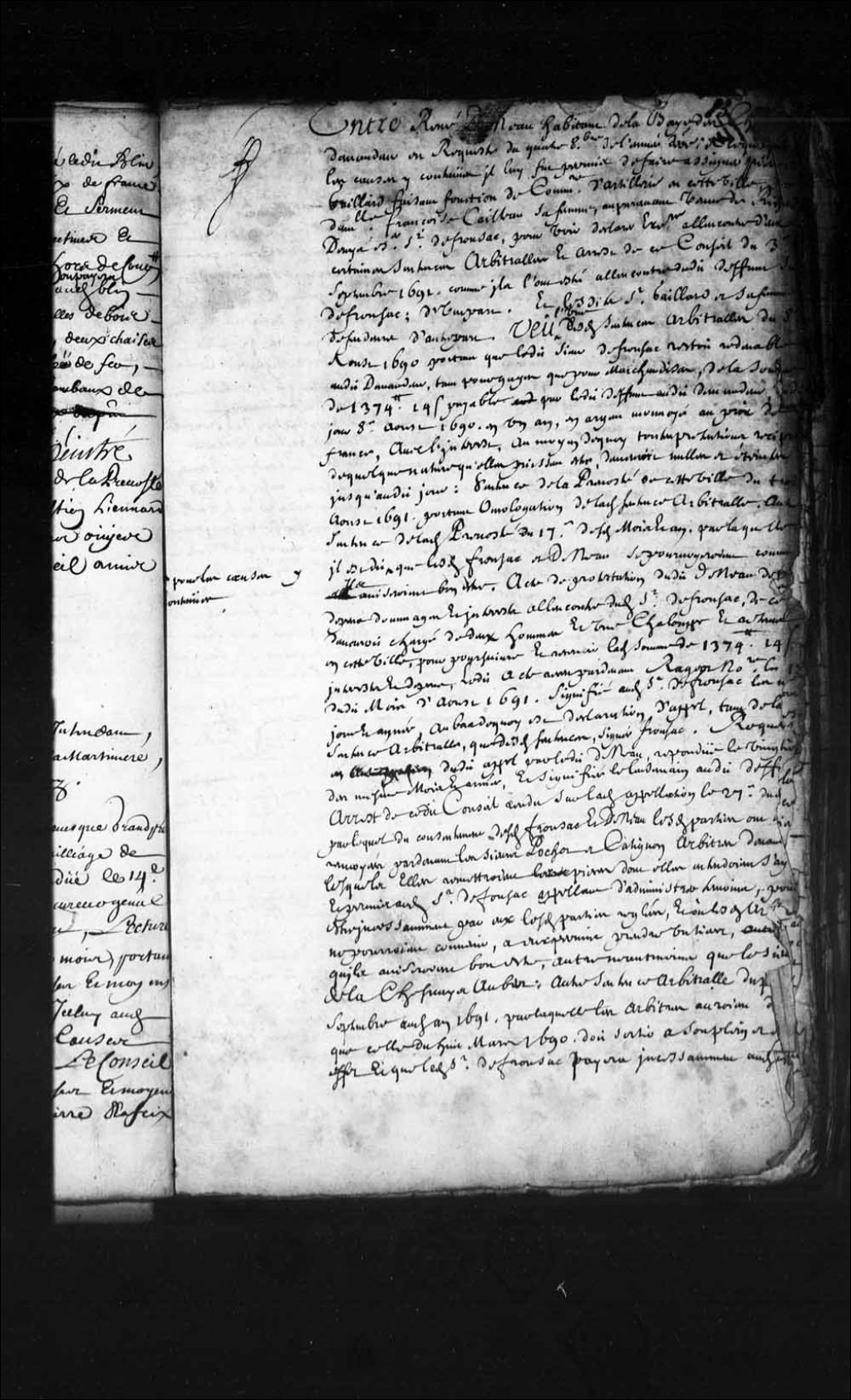 Transcription du texte avec orthographe modernisée : «Entre René DENEAU habitant de la Baie des Chaleurs demandeur en requête du quatre octobre de l'année dernière, à ce que pour les causes y contenues il lui soit permis de faire assigner Pierre Rey Gaillard faisant fonction de commissaire d'artillerie en cette ville et demoiselle Françoise CAILLETEAU sa femme auparavant veuve de Richard Denis écuyer sieur de Fronsac pour voir déclarer exécutoire à l'encontre d'eux, certaines sentences arbitrales et arrêt de ce Conseil du trois septembre 1691 comme Ils l'ont été à l'encontre dudit feu sieur de Fronsac d'une part et lesdits sieur GAILLARD et sa femme défendeurs d'autre part, vu l'une desdites deux sentences arbitrales du 8e août 1690 portant que ledit sieur de Fronsac restait redevable audit demandeur tant pour gages que pour marchandises de la somme de treize cent soixante-quatorze livres quatorze sols payable par ledit défunt audit [...]