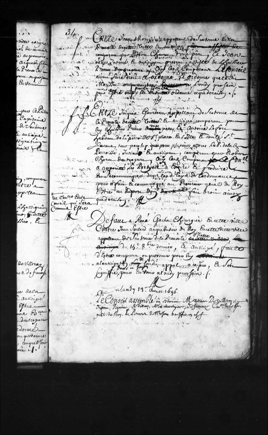 Transcription du texte avec orthographe modernisée : «Défaut à René Gaschet chirurgien en cette ville, contre Jean Soulard arquebusier du Roi en cette dite ville appelant de sentence de la prévôté d'icelle du quinze octobre dernier et anticipé, faute d'être comparu ou personne pour lui à l'anticipation de sondit appel à ce jour et soit signifié dans ce jour pour en venir à lundi prochain. ROUER DE VILLERAY.»