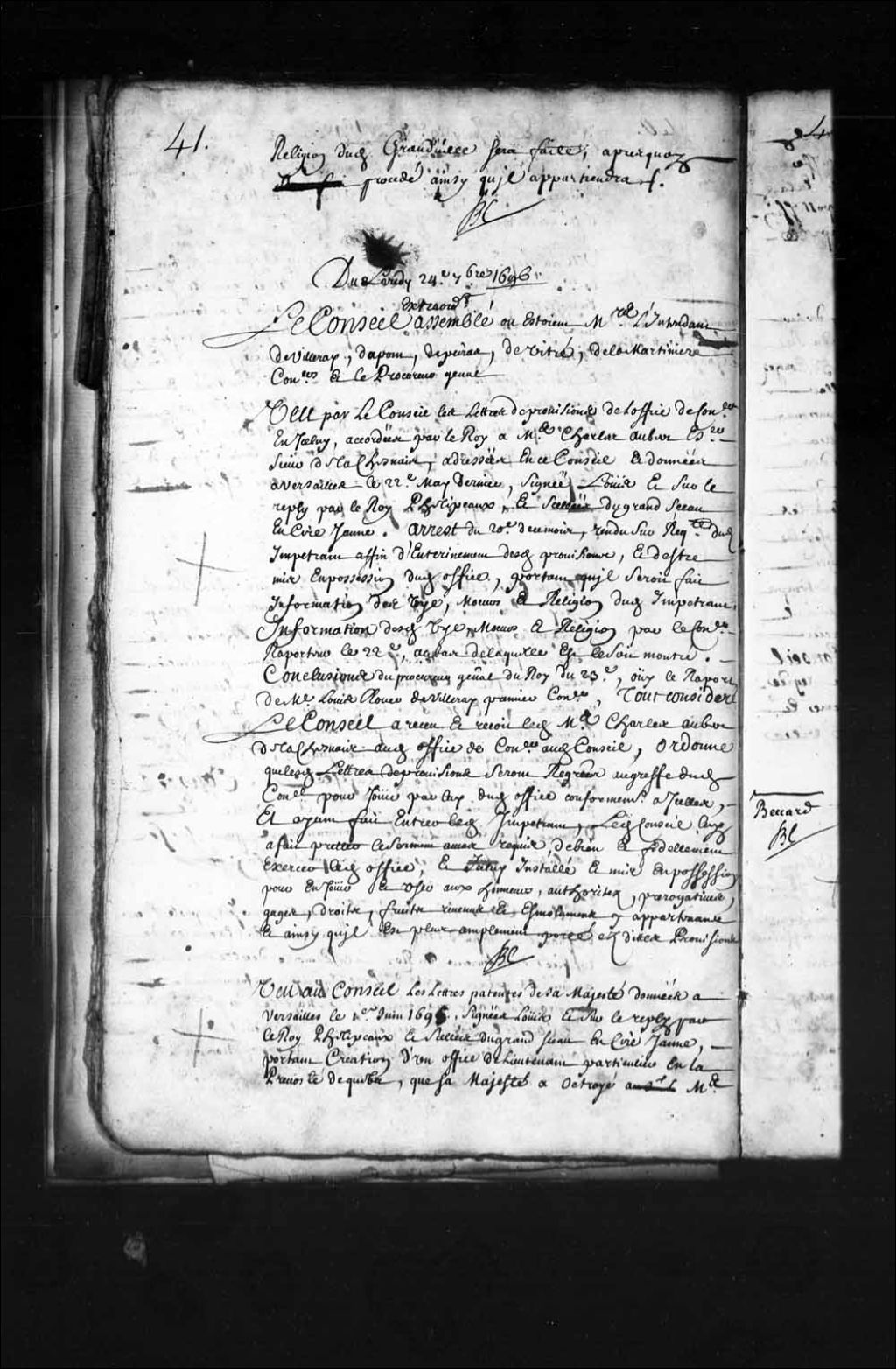 Transcription du texte avec orthographe modernisée : «Vu au Conseil les lettres patentes de sa Majesté données à Versailles le premier juin mille six cent quatre-vingt-quinze signées Louis et sur le repli par le Roi Phelipeaux et scellées du grand sceau et cire jaune portant création d'un lieutenant particulier en la prévôté de Québec que sa Majesté a octroyé à maître Paul Dupuy son procureur en ladite prévôté pour connaître en l'absence, empêchement ou prise à partie du lieutenant général de ladite prévôté de toutes matières tant civiles, criminelles que de police, commerce et navigation suivant les us et coutumes du royaume et de la prévôté et vicomté de Paris: requête dudit sieur Dupuy et arrêt rendu sur icelle, portant que lesdites requête et provisions seraient montrées au procureur général pour sur ses conclusions être fait droit et les conclusions dudit procureur général. Le Conseil a reçu et reçoit ledit maître Paul Dupuy audit office de lieutenant particulier en ladite prévôté, ordonne que lesdites lettres de provisions seront registrées au greffe d'icelui pour sortir leur plein et entier effet, mande ledit Conseil au lieutenant général en ladite prévôté de le mettre et instituer en possession dudit office pour l'exercer et en jouir aux honneurs, autorités, prérogatives, prééminences, exemptions, gages, droits, fruits, profits, revenus et émoluments y appartenant, et ayant fait entrer ledit impétrant. Le Conseil lui a fait prêter le serment au cas requis de bien et fidèlement exercer ledit office. BOCHART CHAMPIGNY.»