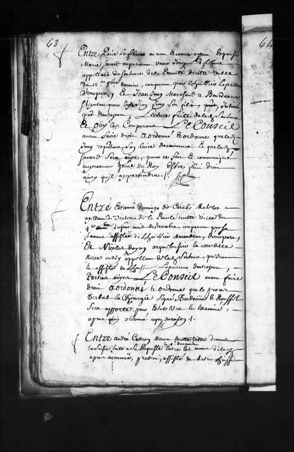 Transcription du texte avec orthographe modernisée : «Entre Pierre Lefebvre au nom et comme ayant épousé Marie Savard auparavant veuve Joseph Lefebvre appelant de sentence de la prévôté de cette ville du douze octobre dernier, comparant par l'huissier Lepailleur, d'une part et Jean JUNG marchand à Bourdeaux stipulant pour lui Jean Jung son fils, intimé, présent d'autre part, lecture faite de ladite sentence, et ouï les comparants. Le Conseil avant faire droit a ordonné et ordonne que ledit Jung représentera son livre de commerce et que ladite Savard sera ouïe pour ce fait et communiqué au procureur général du Roi être fait droit ainsi qu'il appartiendra. BOCHART CHAMPIGNY.»