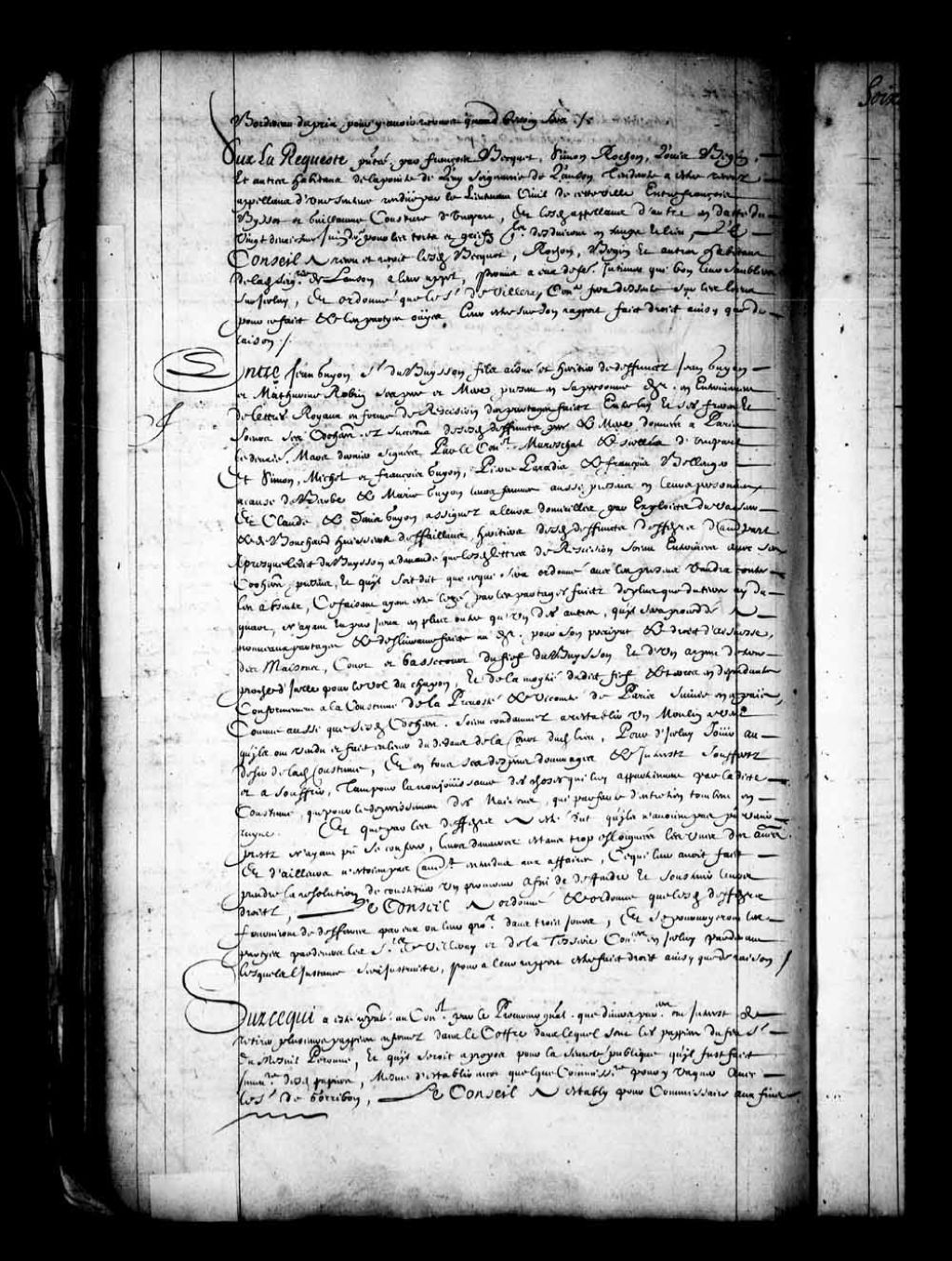 Transcription du texte avec orthographe modernisée : «Sur la requête présentée par François Becquet, Simon Rochon, Louis Begin, et autres habitants de la Pointe de Lévy seigneurie de Lauson tendante à être reçus appelant d'une sentence rendue par le lieutenant civil de cette ville entre François Byssot et Guillaume Couture d'une part, et lesdits appelants d'autre en date du vingt-deuxième juin dernier pour les torts et griefs qu'ils déduiront en temps et lieu, le Conseil a reçu et reçoit lesdits Becquet, Rochon, Begin et autres habitants de ladite seigneurie de Lauson à leur appel, permis à eux de faire intimer qui bon leur semblera sur icelui, et ordonné que le sieur de Villeray conseiller fera descente sur les lieux pour ce fait et les parties ouïes leur être sur son rapport fait droit ainsi que de raison.»