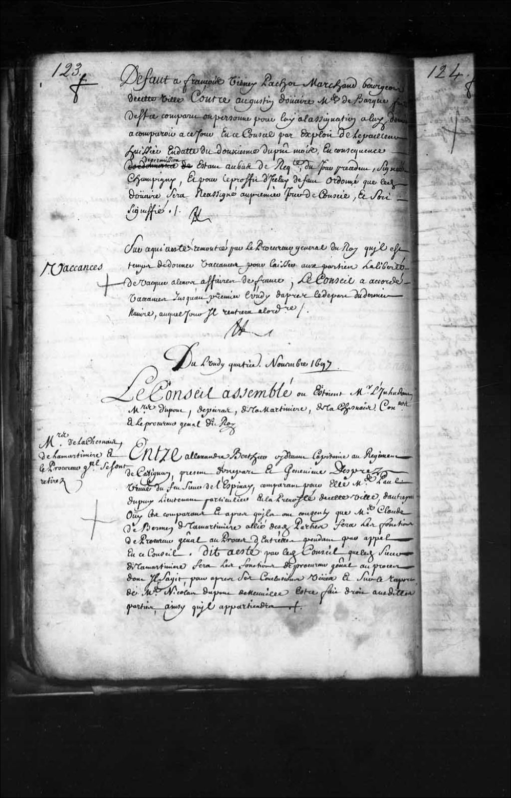 Transcription du texte avec orthographe modernisée : «Défaut à François Vienney Pachot marchand bourgeois de cette ville, contre Augustin Douaire maître de barque faute d'être comparu ou personne pour lui à l'assignation à lui donnée à comparoir à ce jour en ce Conseil par exploit de Lepailleur huissier en date du douze du présent mois en conséquence de permission étant au bas de requête du jour précédent signée Champigny et pour le profit d'icelui défaut ordonné que ledit douaire sera réassigné au premier jour de Conseil. Et soit signifié. ROUER DE VILLERAY.»