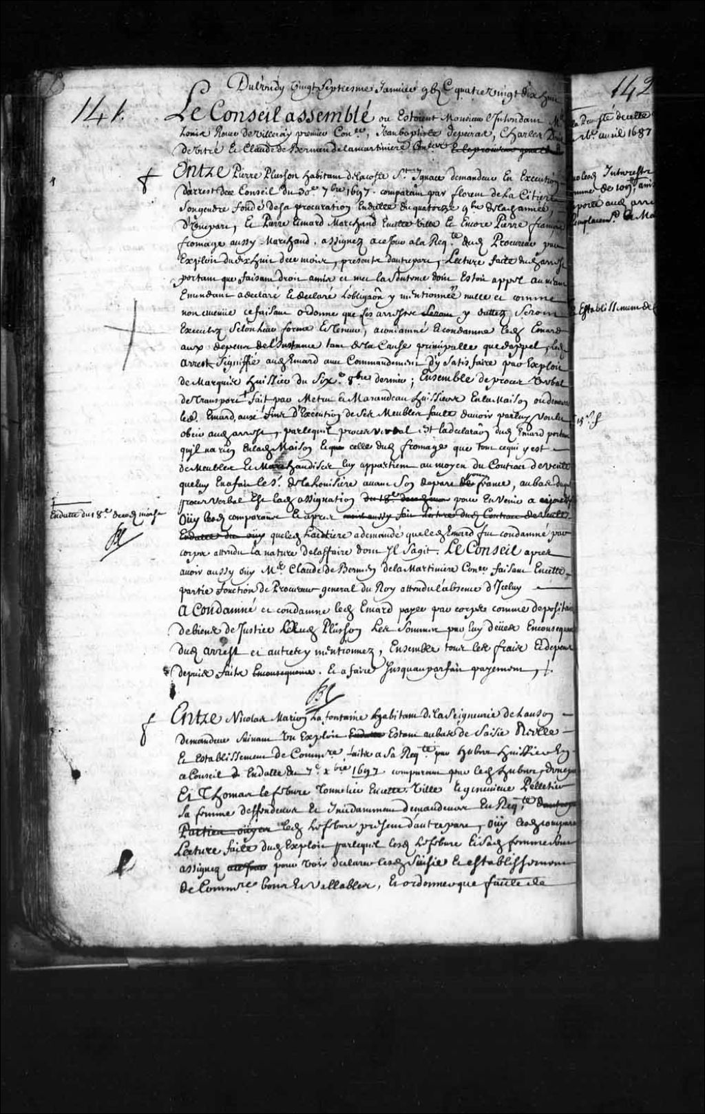 - Transcription du texte avec orthographe modernisée : «Entre Nicolas Marion LAFONTAINE habitant de la seigneurie de Lauson demandeur suivant un exploit étant au bas de saisie réelle et établissement de commissaire faits à sa requête par Hubert huissier en ce Conseil en date du septième décembre 1697 comparant par ledit Hubert d'une part et Thomas Lefebvre tonnelier en cette ville et Geneviève PELLETIER sa femme défendeurs et incidemment demandeurs en requête, ledit Lefebvre présent d'autre part ouï lesdits comparants, lecture faite dudit exploit par lequel lesdits Lefebvre et sa dite femme sont assignés pour voir déclarer lesdites saisie et établissement de commissaire bons et valables et ordonner que faute de payement des sommes de mille vingt livres d'une part et de trois cent quatre-vingt-onze livres neuf sols d'autre contenue dans une sentence de la prévôté de cette ville du 26e avril 1687, de celle de cent dix-neuf livres mentionnée dans l'arrêt du seize février 1693 confirmatif de ladite sentence et encore de celle de trente-quatre livres neuf sols comprise à l'exécutoire du 16e décembre 1695. Intérêts, frais et dépens, sauf à déduire sur lesdits intérêts la somme de cent neuf livres ainsi qu'il est porté audit arrêt, l'emplacement et maison avec leurs circonstances et dépendances dont est mention en ladite saisie réelle ainsi qu'il est dit en icelle seront criés et subhastés par les quatre quatorzaines anciennes et accoutumées et si besoin est vendus et adjugés par décret en ce dit Conseil au plus offrant et dernier enchérisseur en la manière accoutumée, ensemble desdites sentences, arrêts et exécutoire ci-dessus datés et de requête dudit Lefebvre et sa dite femme sans date, le Conseil a déclaré et déclare ladite saisie réelle et établissement de commissaire faits par ledit Hubert, bons et valables permis crier les choses saisies et ordonné que le décret encommencé sera continué et qu'à cette fin affiches avec panonceaux royaux seront mis et lieux et endroits nécessaires, sauf audit Lefebvre et à sa dite femme de justifier avant le parachèvement d'icelui des payements par eux prétendus faits au Marion sur et en déduction desdites sommes, dépens réservés. BOCHART CHAMPIGNY.»