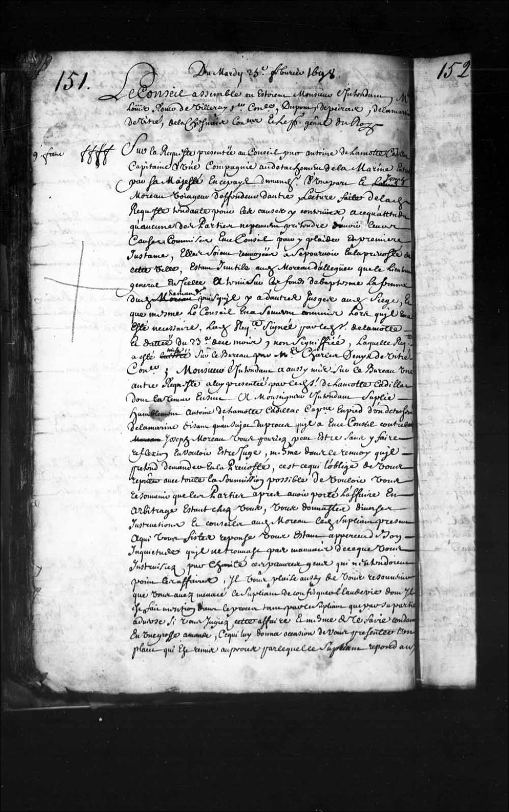 - Transcription du texte avec orthographe modernisée : «Du mardi vingt-cinquième février mille six cent quatre-vingt-dix-huit. Le Conseil assemblé où étaient Monsieur l'intendant, maîtres Louis Rouer de Villeray premier conseiller, Nicolas Dupont de Neuville, Jean-Baptiste Depeiras, Charles Denys de Vitré, Claude de Bermen de La Martinière et Charles Aubert de Lachesnais conseillers et François Madeleine Ruette d'Auteuil procureur général du Roi. Monsieur de Villeray président. Vu la requête présentée au Conseil par Antoine de Lamotte Cadillac capitaine d'une compagnie au détachement de la marine entretenue par sa Majesté en ce pays, demandeur d'une part et Joseph Moreau voyageur défendeur d'autre part, lecture faite de ladite requête tendante pour les causes y contenues à ce qu'attendu qu'aucune des parties ne peuvent prétendre d'avoir leurs causes commises en ce Conseil pour y plaider en première instance, elles soient renvoyées à se [...]