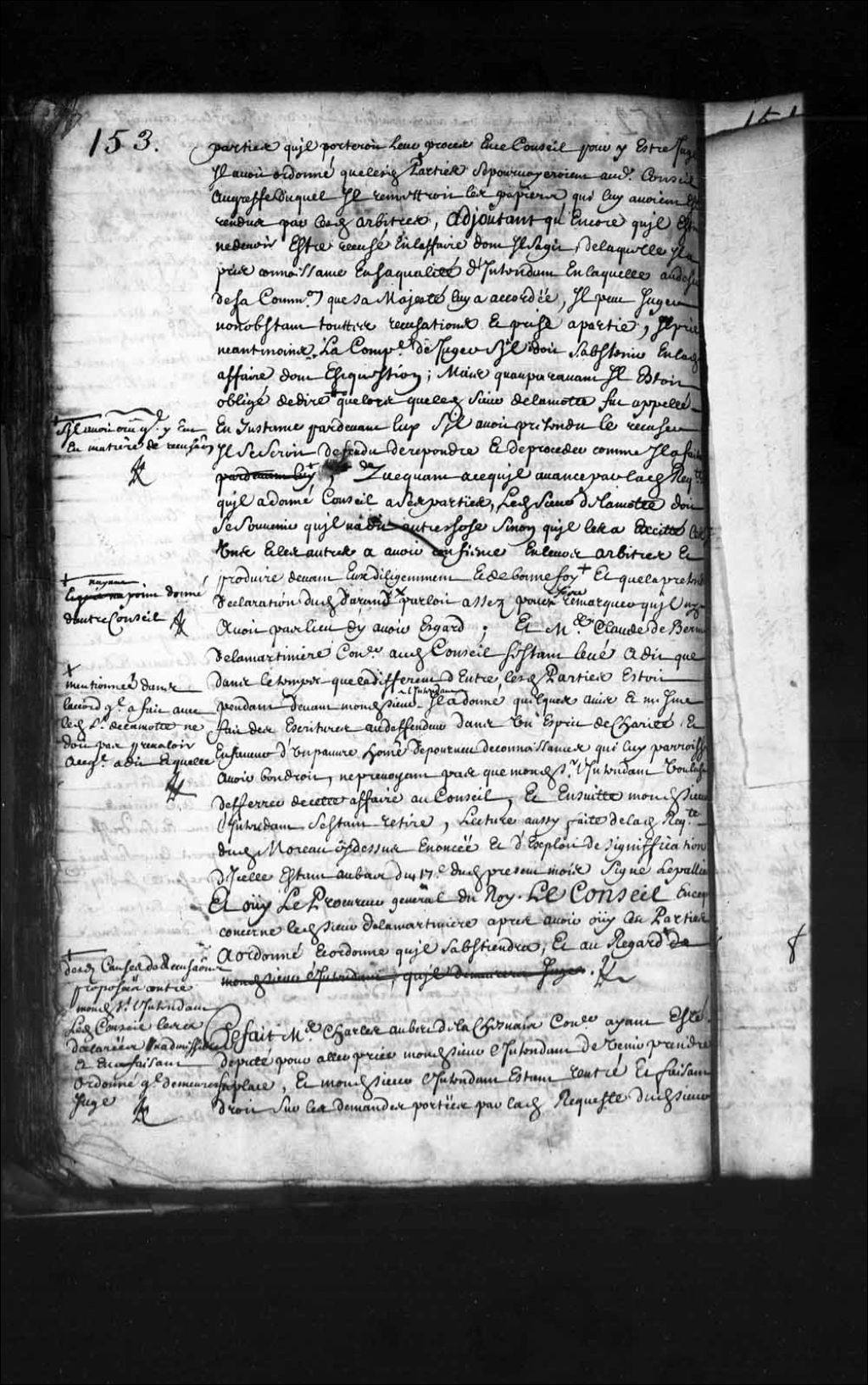 - Transcription du texte avec orthographe modernisée : «Monsieur l'intendant président. Ce fait maître Charles Aubert de Lachesnais conseiller ayant été député pour aller prier mondit sieur l'intendant pour venir prendre sa place, et mondit sieur l'intendant étant rentré, et faisant droit sur les demandes portées par ladite requête du sieur de Lamotte par lui datée du vingt-troisième dudit présent mois, ensemble sur celle dudit Moreau du 17e de ce dit mois et signifiée audit sieur de Lamotte par exploit dudit LePallieur le même jour, et ouï lesdites parties, ensemble le procureur général du Roi. Ledit Conseil au désir de référé de mondit sieur l'intendant, a retenu et retient le procès en question pour être jugé en icelui sur son rapport après l'instruction par lui faite. BOCHART CHAMPIGNY.»