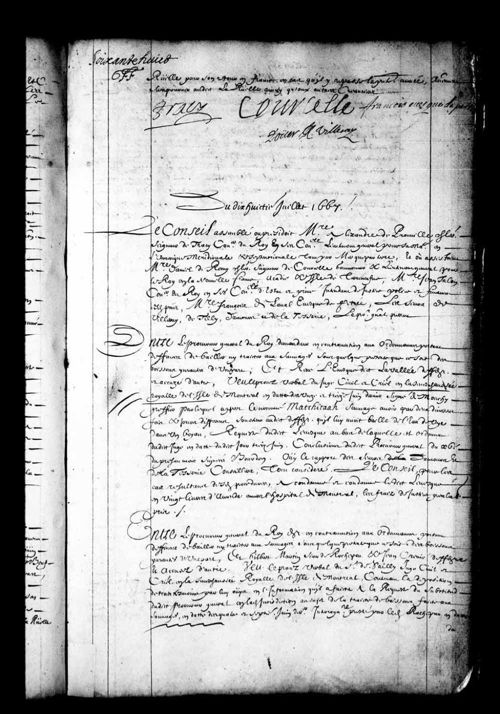 - Transcription du texte avec orthographe modernisée : «Entre le procureur général du Roi demandeur en contravention aux ordonnances portant défenses de bailler ni traiter aux Sauvages sous quelque prétexte que ce soit des boissons enivrantes d'une part et Gilbert Martin sieur de Rochepau et Jean Crevier défendeurs et accusés d'autre. Vu le procès-verbal du sieur de Sailly juge civil et criminel en la sénéchaussée royal de l'île de Montréal contenant la déposition de trois témoins par lui ouïs en l'information qu'il a faite à la requête du substitut dudit procureur général en ladite juridiction au sujet de la traite de boissons faites aux Sauvages en date des quatre et septième juin derniers interrogatoire prêté par ledit Rochepau en date du dixième dudit mois contenant ses confessions et dénégations autre interrogatoire prêté par René Pier sieur de LaBosse en date dudit jour dixième dudit mois récolement et confrontation faite dudit [...]