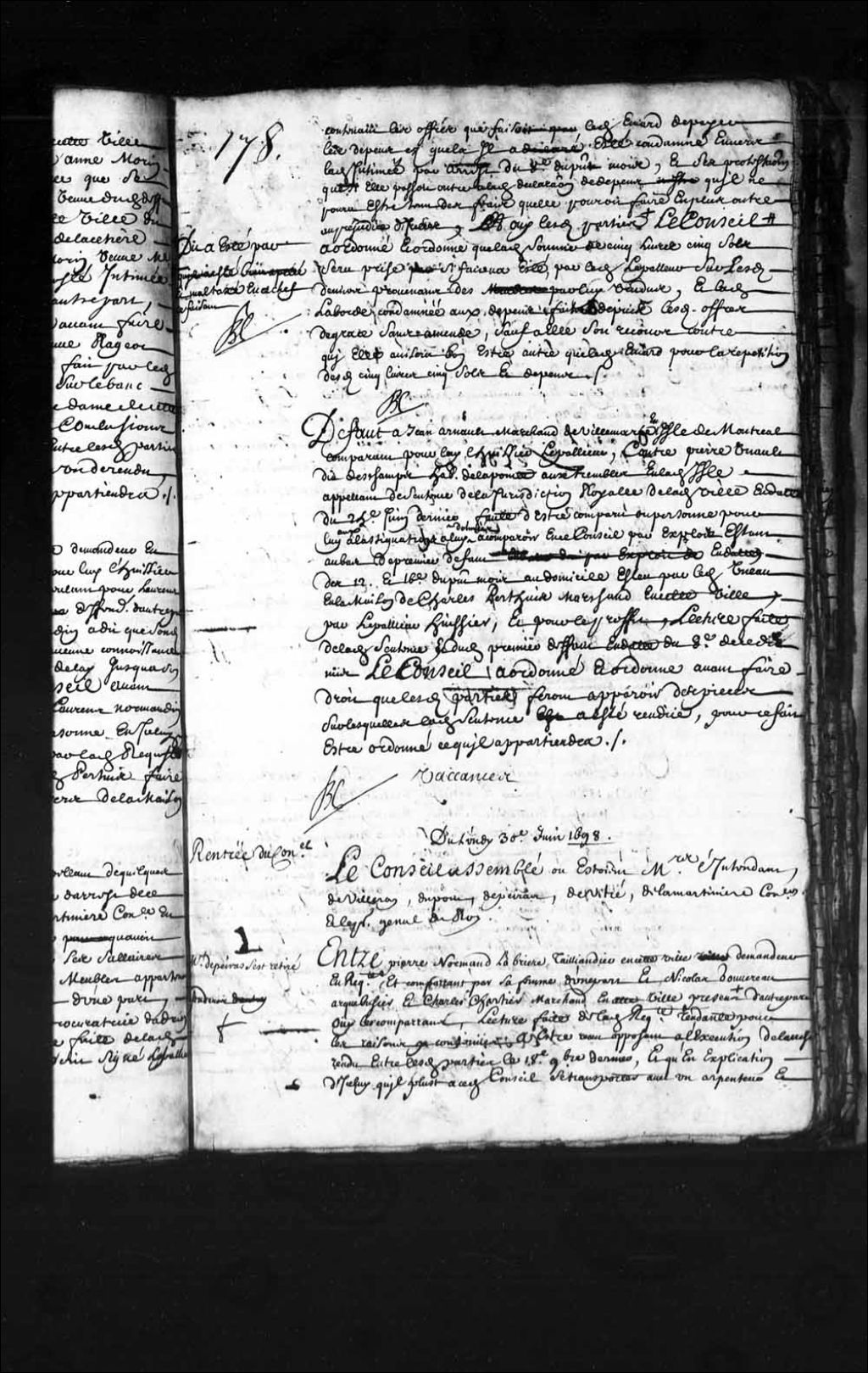 - Transcription du texte avec orthographe modernisée : «Du lundi trentième juin mille six cent quatre-vingt-dix haut. Le Conseil assemblé où étaient Monsieur l'intendant maître de Villeray, Dupont, Depeiras, de Vitré, de La Martinière conseillers et François Madeleine Ruette d'Auteuil procureur général du Roi. Maître Depeiras s'est retiré. Entre Pierre NORMAND LABRIERE taillandier en cette ville demandeur en requête et comparant par sa femme d'une part, et Nicolas GAUVREAU arquebusier et Charles CHARTIER marchand en cette ville présent, défendeur, d'autre part, ouï les comparants, lecture faite de ladite requête tendante pour les raisons y contenues à être reçu opposant à l'exécution de l'arrêt rendu entre lesdites parties le dix-huitième novembre dernier, et qu'en explication d'icelui qu'il plût à ce dit Conseil se transporter avec un arpenteur et telles autres personnes qu'il voudrait nommer en la rue du cul-de-sac de cette ville pour [...]
