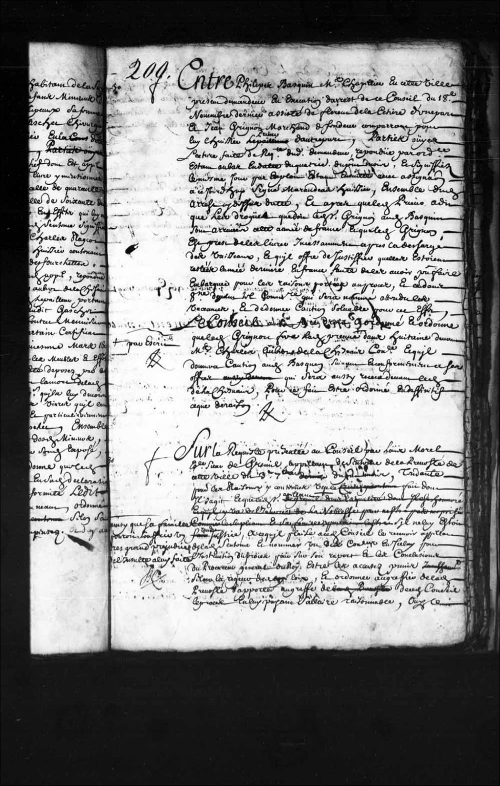 - Transcription du texte avec orthographe modernisée : «Entre Philippe BASQUIN (Bastien) maître chapelier en cette ville présent demandeur en exécution d'arrêt de ce Conseil du dix-huitième novembre dernier, assisté de Florent de Lacetière, d'une part, et Jean GRIGNON marchand défendeur comparant pour lui l'huissier Prieur d'autre part. Parties ouïes, lecture faite de requête dudit demandeur, répondue par ordonnance étant au bas en date du quatrième du présent mois et signifiés le même jour par exploit étant ensuite avec assignation à ce jourd'hui signé Marandeau huissier, ensemble dudit arrêt ci-dessus daté, et après que ledit Prieur a dit que les drogues que doit ledit sieur Grignon audit Basquin sont arrivées cette année de France et que ledit Grignon est prêt de les livrer incessamment après la décharge des vaisseaux et qu'il offre de justifier qu'elles étaient restées l'année dernière en France faute de les avoir pu faire embarquer pour les raisons portées au procès et ce dans huitaine devant tel commissaire qui sera nommé, attendu les vacances et de donner caution solvable pour cet effet. Le Conseil avant faire droit a ordonné et ordonne que ledit Grignon fera ladite preuve par écrit dans huitaine devant maître Charles Aubert de Lachesnais conseiller et qu'il donnera caution audit Basquin suivant et conformément à ses offres, qui sera aussi reçue devant ledit sieur de Lachesnais, pour ce fait être ordonné en définitif ce que de raison. ROUER DE VILLERAY.»