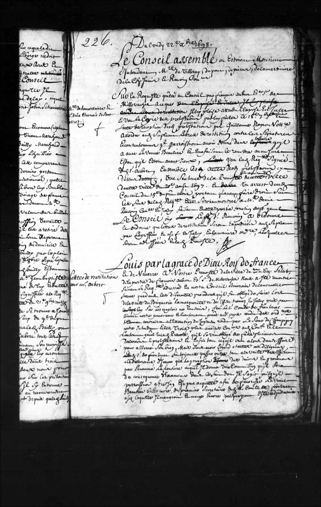 - Transcription du texte avec orthographe modernisée : «Lettres de restitution pour Monsieur Aubert Louis par la grâce de Dieu Roi de France et de Navarre à notre prévôté de la ville de Québec, Salut de la partie de François Aubert écuyer sieur de Millevaches nous a été remontré suivant sa requête adressée en notre Conseil souverain de la Nouvelle-France que dans les différentes procédures qu'il fût obligé de faire lors de la vente du brigantin la Marguerite et des effets trouvés en icelui pris par lui sur les Anglais nos ennemis feu le sieur comte de Frontenac vivant notre gouverneur et lieutenant général audit pays rendit des ordonnances tellement contraires à l'exécution du jugement rendu par le sieur de Champigny notre intendant et les trois plus anciens conseillers audit Conseil et le lieutenant général en ladite prévôté qu'il se vit obligé de faire plusieurs déclarations et protestations et enfin tout ce qu'il crût alors de nécessaire pour assurer son bien, mais sans avoir égard à toutes ces diligences ledit sieur de Frontenac fit toujours passer outre tant à la vente des effets, à la délivrance d'iceux, qu'à la perception des deniers en provenant par le nommé Lalousière auquel il donna une commission qu'il sera de conséquence d'examiner dans le fait dont il s'agit puisqu'il paraîtra qu'il ne s'en est pas acquitté afin de favoriser la veuve Beaulieu belle-mère du premier secrétaire dudit sieur comte de Frontenac chez laquelle il mangeait et mange encore puisqu'ayant été adjudicataire d'une caisse de marchandises de ladite prise il ne l'obligea pas d'en payer le prix ou d'en donner son billet, mais au contraire il la favorisa en tout ce qui lui fut possible dans l'instance que ladite veuve fit au suppliant devant ledit lieutenant général qui s'autorisant sur une déclaration que lui Aubert se vit alors forcé de faire signifier à tous ceux qui achetaient tant pour empêcher la connivence qu'il avait remarqué dans la vente des effets, ce qui lui aurait causé une très grande perte que pour empêcher la délivrance des deniers audit de LaLousière qui ne paraissait pas solvable de répondre d'une telle somme n'ayant aucun bien apparent en ce pays et encore pour faire connaître au public la violence qui lui était faite et sur les ordres qu'il se dit avoir dudit sieur comte de Frontenac comme il le marque dans sa sentence du vingtième jour d'août mille six cent quatre-vingt-dix-sept, ordonne que les effets adjugés à ladite veuve Beaulieu demeureraient entre les mains dudit de Lalousière jusqu'à ce qu'il nous eût plu ordonner sur la disposition dudit brigantin et de sa cargaison, et cependant la déchargé comme il ledit par obéissance auxdits prétendus ordres, du payement de la somme à laquelle se trouvent monter les effets à elle adjugés, sentence de laquelle ledit suppliant se serait porté pour appelant si l'autorité dudit comte de Frontenac avait laissé la liberté a aucun juge supérieur de recevoir son. appel, mais nous ayant par arrêt de notre Conseil du deuxième avril dernier ordonné l'exécution du jugement du neuvième août 1697 sans avoir égard à l'ordonnance dudit sieur comte de Frontenac, le suppliant crut qu'il n'aurait pas de difficulté de recevoir le montant de la vente dudit brigantin. Et effets, cependant ayant été averti que ledit sieur comte de Frontenac en continuant ses bons offices à la belle-mère de sondit secrétaire voulait que ledit suppliant prit pour argent comptant ladite caisse parce qu'elle prétendait l'avoir achetée trop cher, quoi qu'elle ne l'eût enchérie que de cent livres plus qu'un autre, crut que pour ne se pas exposer à de pareilles traitements que ceux qu'il avait souffert l'année précédente et principalement par l'appréhension ou il était que ledit sieur comte de Frontenac ne se servit du prétexte de son opposition pour l'empêcher de toucher en entier les deniers de ladite vente, fit sa déclaration et protestation qu'il déposa cachetées le dix-huitième septembre chez Guillaume Roger notaire royal en ladite ville de Québec par laquelle, il proteste que tout ce qu'il pourra signer ne lui pourra nuire ni préjudicier, ce qu'il renouvela ensuite et déclara de quelle manière il a été forcé de prendre ladite caisse et pour la somme de trente et une livres de fosses cartes en attendant qu'il pût avoir la liberté de poursuivre en justice son juste droit, ce qui se trouvant à présent il nous supplie de lui accorder nos présentes lettres de restitution pour par icelles revenir contre les consentements et signatures qu'il aurait été forcé de donner comme il paraît par sondit exposé. Nous désirant subvenir à nos sujets et traiter favorablement ledit exposant vous mandons que s'il vous appert que l'exposé ci-dessus soit véritable, vous ayez à restituer ledit Aubert contre les consentements et signatures qu'il pourrait avoir dans le fait dont il s'agit, comme nous le restituons par ces présentes autant que besoin est ou serait, et en ce faisant le remettre en tel et semblable état qu'il était auparavant iceux, et au surplus ayez à rendre bonne et brève justice aux Parties sauf l'appel en notre dit conseil, car tel est notre plaisir. Donné en notre dit Conseil souverain à Québec l'an de grâce mille six cent quatre-vingt-dix-huit le vingt-deuxième décembre et de notre règne le cinquante-sixième. BOCHART CHAMPIGNY.»