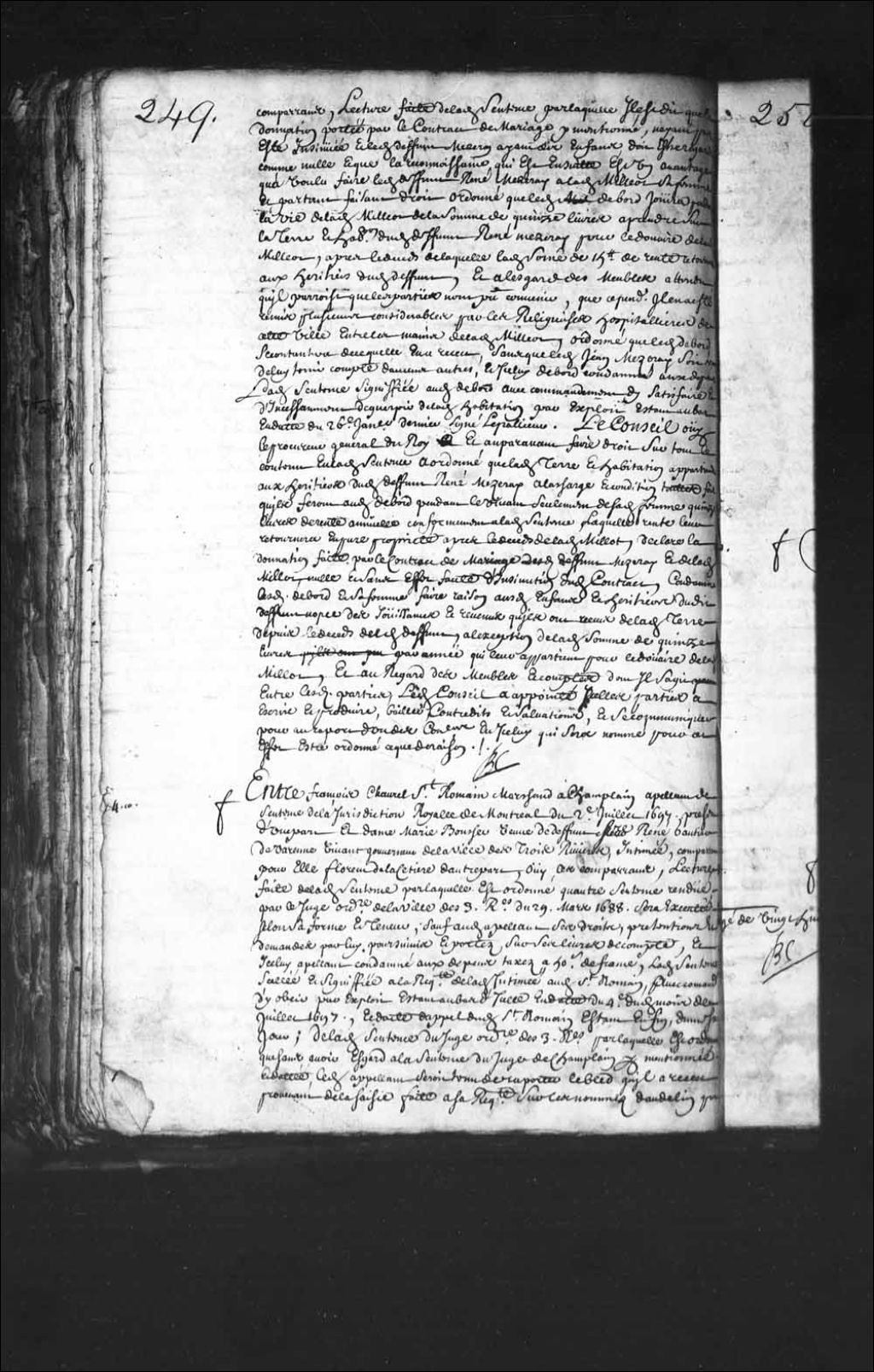 - Transcription du texte avec orthographe modernisée : «Entre François CHOREL Saint-Romain marchand à Champlain appelant de sentence de la juridiction royale de Montréal du 2e juillet 1697 présent d'une part, et dame Marie Boucher veuve de défunt sieur René Gautier de Varennes vivant gouverneur de la ville des Trois-Rivières, intimée, comparant pour elle Florent de Lacetière d'une part; ouï les comparant. Lecture faite de ladite sentence, par laquelle est ordonné qu'autre sentence rendue par le juge ordinaire de la ville des Trois-Rivières du 29e mars 1698 sera exécuté selon sa forme et teneur, sauf audit appelant ses droits prétentions et demandes, par lui poursuivis et portés sur ses livres de comptes, et icelui appelant condamné aux dépens taxes a 50 sols de France, ladite sentence signifiée et scellée à la requête de ladite intimée audit Saint-Romain avec commandement d'y obéir par exploit étant au bas d'icelle en date du quatrième dudit mois de juillet 1697. Et d'acte d'appel dudit Saint-Romain étant enfin du même jour; de ladite sentence du juge ordinaire des Trois-Rivières par laquelle est ordonné que sans avoir égard à la sentence du juge de Champlain y mentionnée et datée, ledit appelant serait tenu de rapporter le blé qu'il a reçu provenant de la saisie faite à sa requête sur les nommés Daudelin pour être délivré à ladite intimée, sauf audit appelant son recours contre lesdits daudelin et aussi pour la répétition des frais par lui faits pour ladite saisie et en conséquence; d'acte d'affirmation faite par ladite intimée au greffe dudit conseil de son départ de Ville-Marie et arrivée en cette ville pour faire juger ladite appellation, et de sa protestation; de répéter les frais de son voyage, séjour et retour à l'encontre du appelant en date du 23e septembre de ladite année 1697. signifié à partie le 5e octobre ensuivant; de pouvoir donné par ladite intimée audit de Lacetière de comparaître pour et icelle représenter dans la présente instance en date du dix-neuvième dudit mois d'octobre; de requête de ladite intimée au bas de laquelle est ordonnance portant permission de faire assigner ledit appelant en ce Conseil, du 29e dudit mois, signifiés audit Saint-Romain avec assignation à ce jourd'hui par exploit de Normandin huissier du onzième du présent mois, et d'un billet signé Saint-Romain par lequel il consent de comparaître ce jourd'hui conformément à ladite assignation dudit jour. Dit a été par le Conseil qu'il a été bien jugé par lesdites sentences des juridictions royales desdites Trois-Rivières et Montréal, et mal et sans grief appelé, condamne ledit Saint-Romain aux dépens tant de cause principale que d'appel de grâce sans amende. BOCHART CHAMPIGNY.»