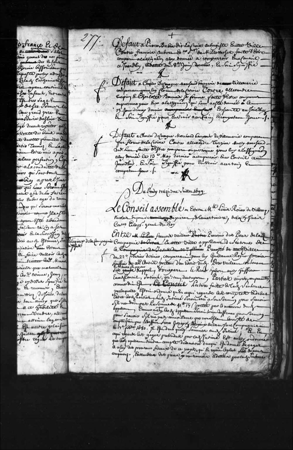 Défaut accordé à Charles de Couagne, marchand bourgeois de Ville-Marie contre Alexandre Turpin et Charlotte Beauvais, sa femme, 6 juillet 1699, Archives nationales à Québec, Fonds Conseil souverain, (03Q,TP1,S28,P5287).