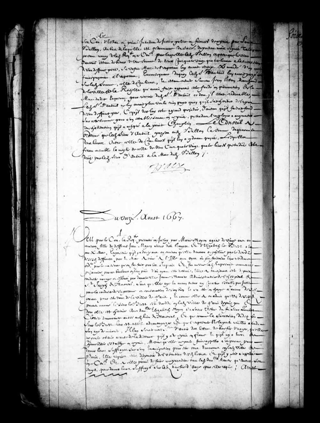 - Transcription du texte avec orthographe modernisée : «Du onzième août 1667. Vu par le Conseil la requête présentée en icelui par Marie Moyen âgée de vingt ans ou environ fille de défunt Jean Moyen sieur des Granges et de Elisabeth le Brest ses père et mère, expositive qu'il y a douze ans ou environ qu'elle demeura orpheline par le décès de sesdits défunts père et mère arrivé à l'île aux oies, ou ils faisaient leur résidence ordinaire par le massacre qui en fut fait par les Iroquois, et fut même ladite exposante emmenée prisonnière par ces barbares en leur pays d'où ayant été retirée, elle a toujours été depuis conduite nourrie et élevée par demoiselle Jeanne Mance administratrice de l'hôpital de Saint-Joseph de Montréal, sans qu'elle aie eu aucun tuteur ni curateur établi par justice pour la conduite de sa personne et conservation de son bien et n'a été en charge a aucun de ses parents pour être tous de la ville de Paris, et comme elle [...]