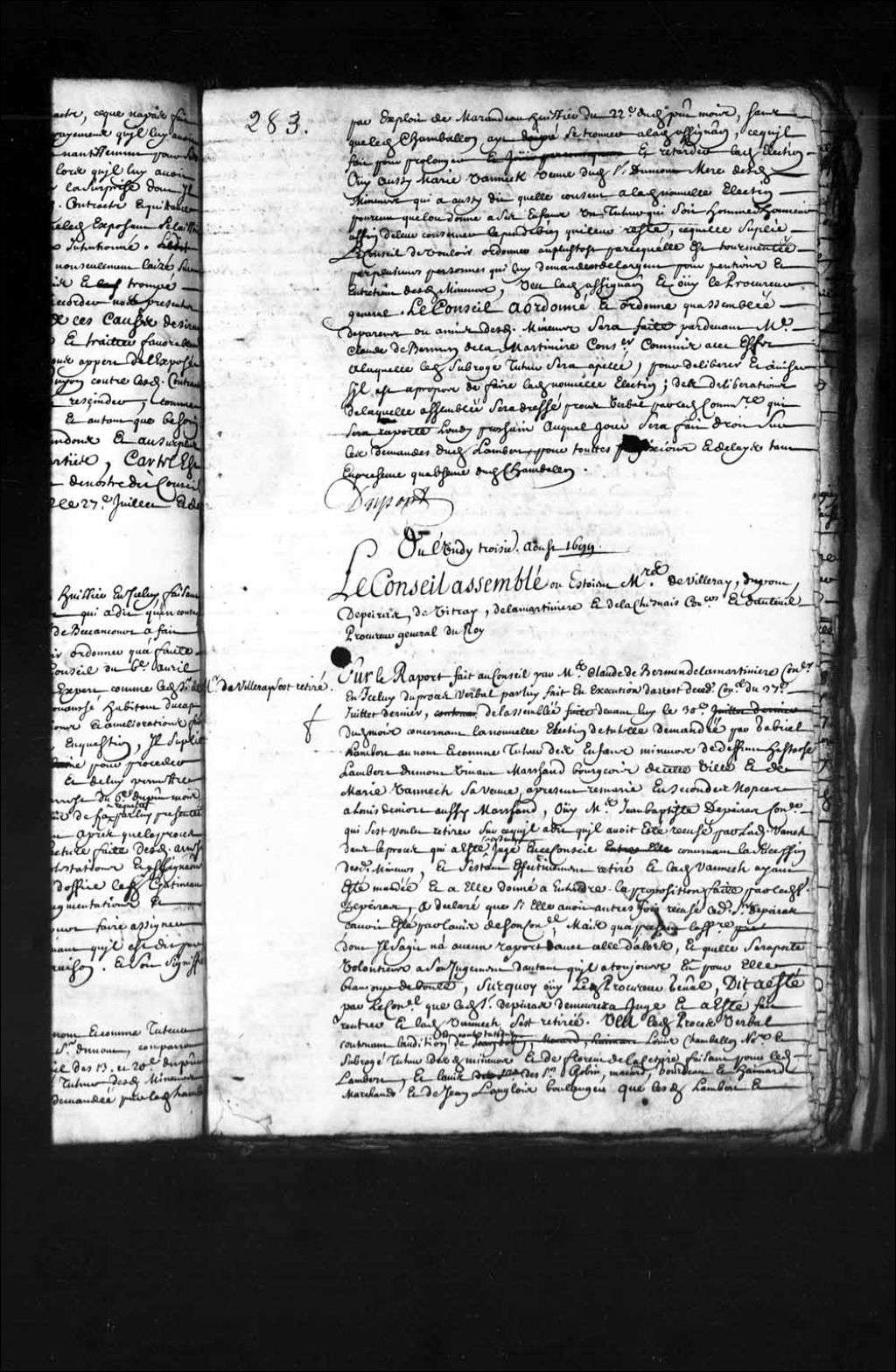 Transcription du texte avec orthographe modernisée : «Du lundi troisième août mille six cent quatre-vingt-dix-neuf. Le Conseil assemblé où étaient maîtres Louis Rouer de Villeray premier conseiller, Nicolas Dupont de Neuville, Jean-Baptiste Depeiras, Charles Denys de Vitré, Claude de Bermen de La Martinière et Charles Aubert de Lachesnais conseillers et François Madeleine Ruette d'Auteuil procureur général du Roi. Monsieur de Villeray s'est retiré. Sur le rapport fait au Conseil par maître Claude de Bermen de la Martinière conseiller en icelui du procès-verbal par lui fait en exécution d'arrêt de ce dit Conseil du 27e juillet dernier de l'assemblée faite devant lui le 30e dudit mois concernant la nouvelle élection de tutelle demandée par Gabriel Lambert au nom et comme tuteur des enfants mineurs de défunt Eustache Lambert Dumont vivant marchand bourgeois de cette ville et de Marie Vannech (Vanneck), sa veuve à présent remariée en [...]