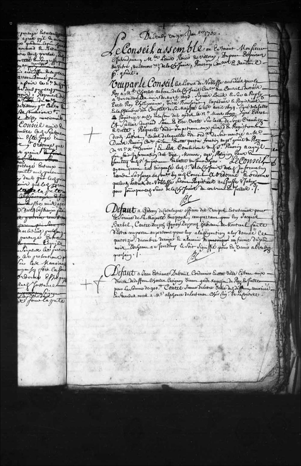 Défaut à Jean Étienne Dubreuil, cordonnier de Québec, étant aux droits du défunt Charles Catignon, garde magasin du Roi, pour la somme de 900 livres contre Jeanne Delettre (Delestre), veuve du dit défunt et remariée en secondes noces au sieur Alphonse de Lestenon, chevalier et seigneur de La Couture pour la somme de 900 livres, 11 janvier 1700, Archives nationales à Québec, Fonds Conseil souverain, (03Q,TP1,S28,P5372).