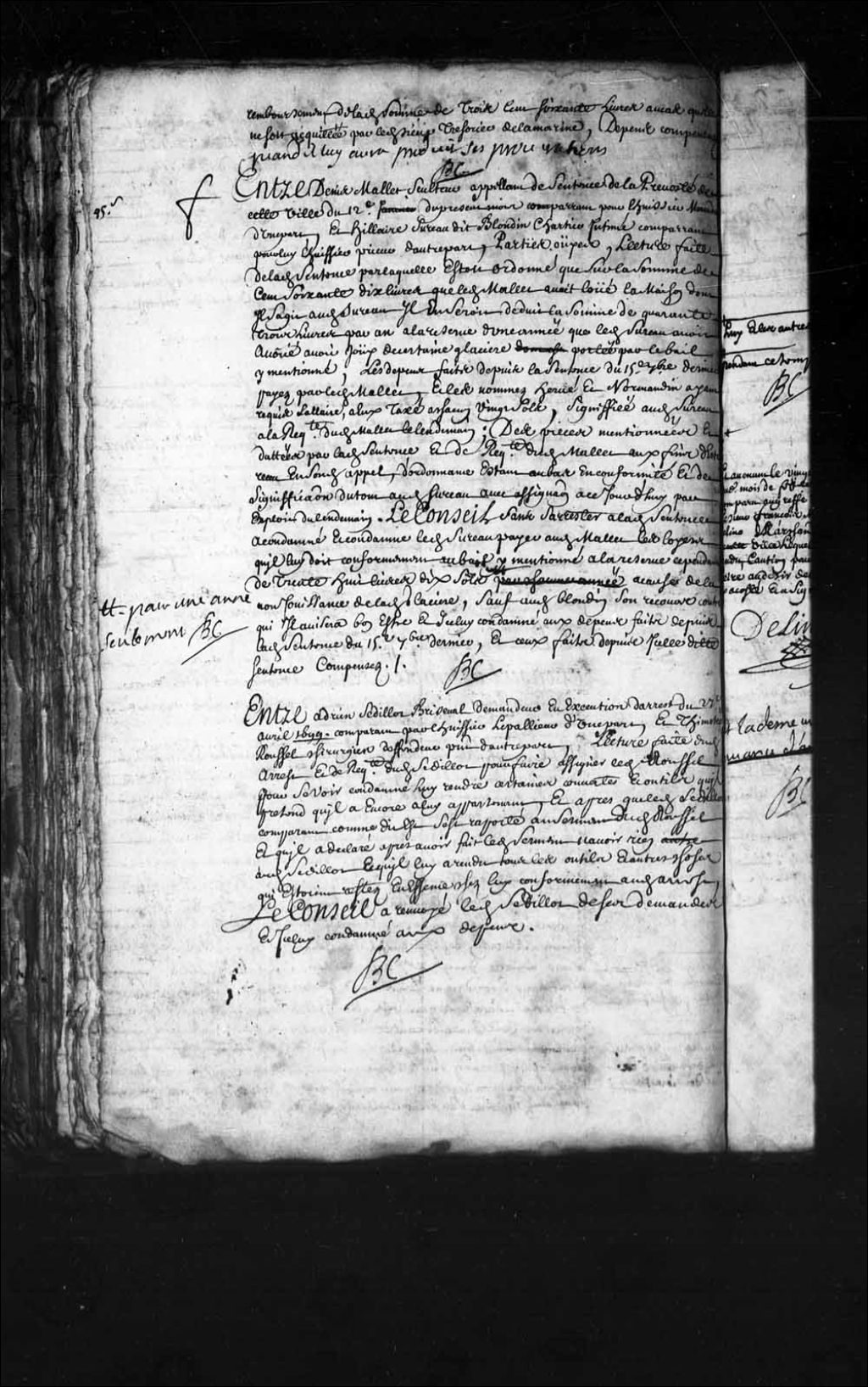 Renvoi avec dépens de la requête d'Adrien Sédilot dit Briseval qui demande la restitution de certaines couvertures et outils par Timothée Roussel, chirurgien, 25 janvier 1700, Archives nationales à Québec, Fonds Conseil souverain, (03Q,TP1,S28,P5383).
