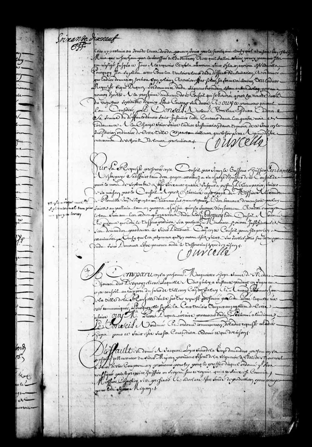 Transcription du texte avec orthographe modernisée : «A comparu en sa personne Marguerite Hayot femme de Médard Chouart dit Desgroyzeliers laquelle a dit qu'il y a instance pendante en jugement en ce conseil au rapport du sieur de Villeray conseiller en icelui et Arnaud Peré marchand de la ville de La Rochelle d'autre sur une requête présentée par ledit Peré laquelle n'a été communiquée, pourquoi elle supplie la Cour vouloir vaquer au jugement de cette affaire, ouï maître Pierre Duquet notaire procureur dudit Peré trouvé à l'audience, Le Conseil a ordonné et ordonne communication de ladite requête à ladite Hayot pour ce fait être sur ses contredits ordonné ce que de raison.»