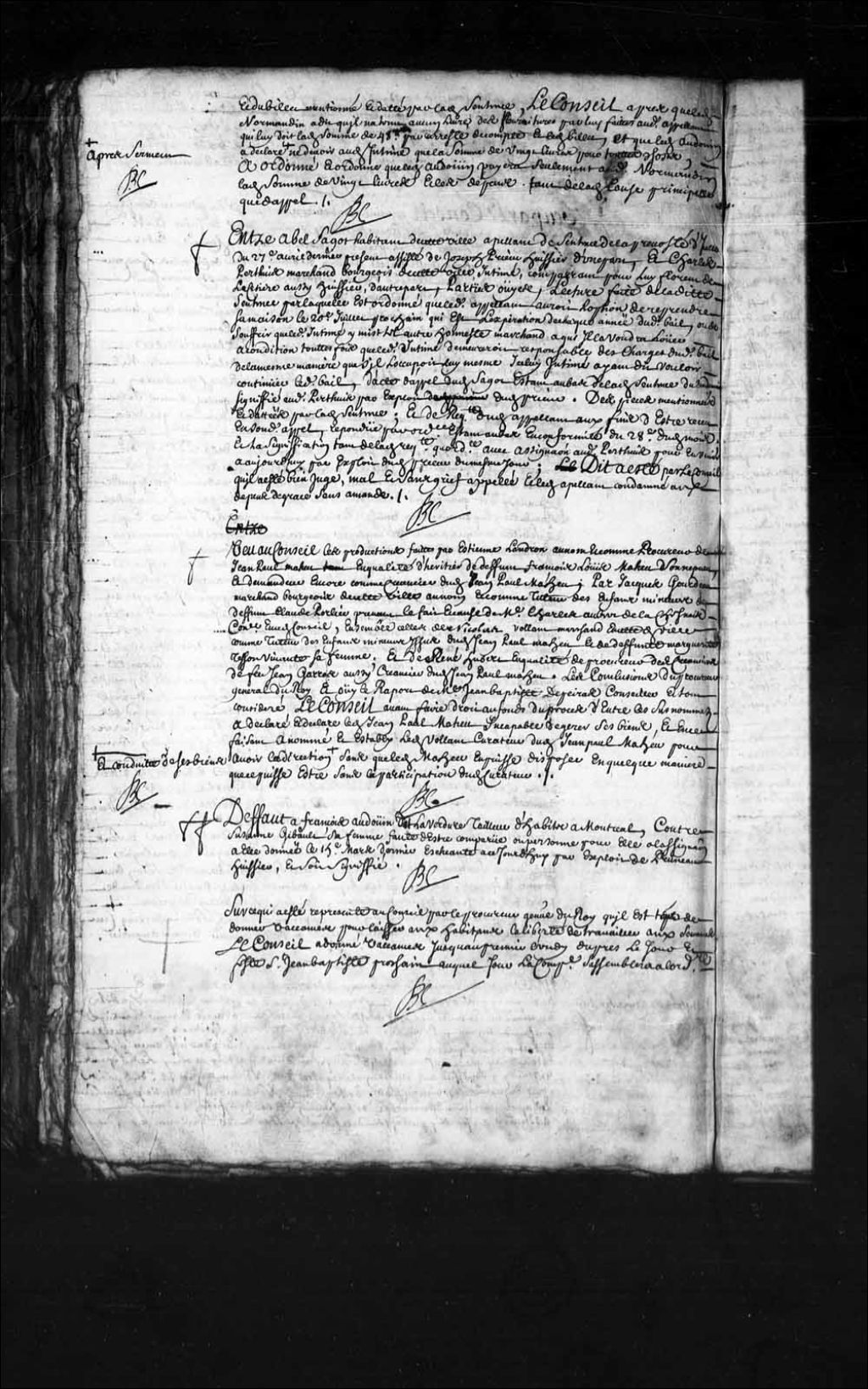 - Transcription du texte avec orthographe modernisée : «Vu au Conseil les productions faites par Etienne Landron au nom et comme procureur de Jean-Paul Maheu en qualité d'héritier de défunt François Louis Maheu son neveu, et demandeur encore comme créancier dudit Jean-Paul Maheu par Jacques Gourdeau marchand bourgeois de cette ville au nom et comme tuteur des enfants mineurs de défunt Claude Porlier prenant le fait et cause de défunt maître Charles Aubert de Lachesnais conseiller en ce Conseil, ensemble celles de Nicolas Volant marchand en cette dite ville comme tuteur des enfants mineurs issus dudit Jean-Paul Maheu et de défunte Marguerite Tesson sa femme, et de René Hubert en qualité de procureur des créanciers de défunt Jean Garros aussi créancier dudit Jean-Paul Maheu; les conclusions du procureur général du Roi et ouï le rapport de maître Jean-Baptiste Depeiras conseiller et tout considéré. Le Conseil avant faire droit au fonds du procès d'entre les sus-nommés, a déclaré et déclare ledit Jean-Paul Maheu incapable de gérer ses biens, et en ce faisant a nommé et établi ledit Volant curateur dudit Jean-Paul Maheu pour avoir la direction et conduite de ses biens, sans que ledit Maheu en puisse disposer de quelque manière que ce puisse être sans la participation dudit curateur. BOCHART CHAMPIGNY.»
