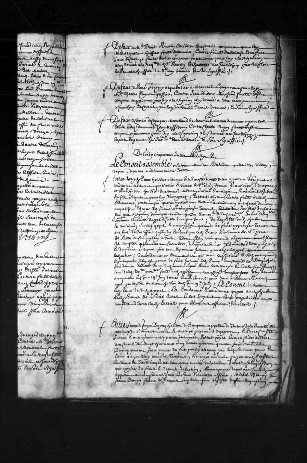 Transcription du texte avec orthographe modernisée : «Entre François GUYON DESPREZ (Després) habitant de Beauport appelant de sentence de la prévôté de cette ville du onzième du présent mois et anticipé, présent d'une part, et Pierre CRESTE (Crête) intimé et anticipant aussi présent d'autre part. Parties ouïes, lecture faite d'arrêt de ce Conseil du 28e juin dernier portant qu'avant faire droit que ledit Desprez pourrait faire preuve des faits par lui allégués par ladite sentence pour en venir à aujourd'hui avec ses témoins si mieux n'aimait payer audit Creste la somme de 35 livres tant pour moitié de la valeur de la vache en question que moitié des frais et dépens de l'action, en conséquence duquel arrêt ledit appelant aurait fait assigner le sieur de LaSalle officier, Michel Beaugy (Baugis, Bougie) et Jeanne Beaugy femme de François Langlois pour déposer du fait en question lesquels témoins étant comparus ont en présence desdites parties prêtés le serment au cas requis, après quoi ledit intimé aurait fourni pour moyens de reproches à l'encontre dudit sieur de LaSalle qu'il a une si grande attache pour la famille dudit appelant que quoi qu'il ait son logement chez un des autres habitants dudit Beauport il ne laisse pas de se trouver journellement depuis le matin jusqu'au soir dans sa maison pour laquelle il ne se peut empêcher de marquer en toutes rencontres son attachement, et à l'égard des deux autres témoins n'avoir rien autre chose à dire sinon qu'ils sont les créatures dudit Desprez chez lequel Ils sont presque toujours et de qui Ils ont souvent affaire, sur quoi, le Conseil a ordonné et ordonne que lesdits témoins seront ouïs, sauf en jugeant avoir tel égard que de raison auxdits moyens de reproches, et après que par ledit sieur de LaSalle a été dit qu'il a vu que dans le temps que le fils et vacher dudit appelant emmenaient les bestiaux dudit intimé pour les arrêter et resserrer chez ledit appelant après les avoir trouvé en dommage dans ses prairies et pacages, ledit intimé serait survenu qui aurait repris et remené chez lui la plus grande partie desdits bestiaux avec beaucoup de précipitation en les faisant courir. par ledit Beaugy a été aussi dû que le lendemain que les bestiaux dudit Creste ont été en dommage chez ledit Desprez il a remarqué que ledit Creste courait beaucoup sesdits bestiaux pour les empêcher d'aller en dommage chez le nommé Chevalier son voisin et les repoussa chez lui en les faisant beaucoup courir, et par ladite Jeanne Beaugy a été dit la même chose que sondit frère, sur quoi ledit Conseil mettant ledit appel et ce dont aurait été appelé au néant a condamné et condamne ledit Desprez payer seulement audit Creste ladite somme de trente-cinq livres, et les dépens qui ont été et seront faits depuis et compris ledit arrêt du vingt-quatrième juin dernier. BOCHART CHAMPIGNY.»