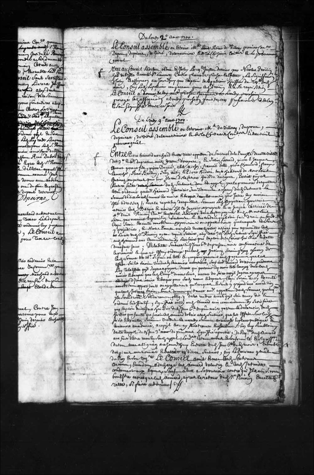 Transcription du texte avec orthographe modernisée : «Du lundi deuxième août 1700. Le Conseil assemblé où étaient maîtres de Villeray, Dupont, Depeiras, de Vitré, de Lamartinière et de Lachesnais conseillers et d'Auteuil procureur général. Vu par le Conseil le défaut obtenu en icelui le 19e juillet dernier par Nicolas Drouin habitant de l'île et comté de Saint-Laurent, contre François Frichet calfateur, la signification d'icelui et assignation à ce jourd'hui par exploit de Lepallieur huissier du 24e dudit mois, ouï ledit Lepallieur comparant pour ledit Drouin et à sa réquisition, le Conseil a prorogé ladite assignation à lundi prochain pour toutes préfixions et délais et soit signifié dans ce jour. DUPONT.»