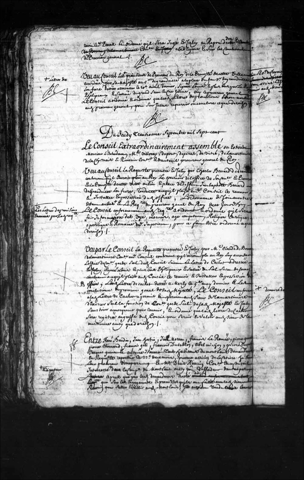 Transcription du texte avec orthographe modernisée : «Entre René BAUDIN (Beaudin), Jean HOSTIN (Ostain), Jean Moreau, François LARAMÉE Pierre QUENET (Ganet, Guenet, Guenette), Pierre CHOINARD (Chonard), François GELY (Gélis), François DUSABLON, Abel MICHON, Pierre DUGUAY, Jacques QUENET (Ganet, Guenet, Guenette) et Antoine SOUARD tous habitants du Mont Louis, demandeurs en requête répondue le 27e de ce mois, présents, assistés de LaCetière huissier leur procureur d'une part, et maître Denis RIVERIN conseiller en ce Conseil, intéressé et directeur en la compagnie du Mont Louis, aussi présent défendeur, d'autre part, après que par les demandeurs a été dit que sur les engagements et promesses qu'ils ont faites avec ledit sieur Riverin pour s'aller établir audit lieu du Mont Louis, Ils auraient vendu leurs terres et habitations qu'ils avaient aux environs de cette ville, leurs bestiaux excepté ceux qu'ils ont pu mener audit lieu du Mont Louis et quitté toutes leurs habitudes croyant qu'ils seraient bien établis audit lieu suivant les promesses dudit sieur Riverin, auquel lieu Ils ont fait des travaux considérables sur les habitations à eux concédée, mais le sieur de Clermont étant arrivé l'été dernier audit Mont Louis se disant intéressé dans les parts des associés dudit sieur Riverin qui sont en France et directeur de ladite habitation se serait mis en possession de tous les vivres et effets dudit lieu, ce que voyant les demandeurs Ils se seraient adressés à lui pour avoir des vivres et autres nécessités conformément aux promesses dudit sieur défendeur, ce qu'il leur aurait refusé en leur déclarant qu'il n'avait ni vivres ni emploi à leur donner, ce qui les ayant mis dans l'impossibilité de pouvoir subsister audit lieu, Ils ont été contraints d'abandonner leur établissement, blés et autres grains encore sur terre, bestiaux et généralement tout ce qu'ils y avaient plutôt que de périr par la faim et de s'embarquer au nombre de près de 60 personnes pour revenir en cette ville avec si peu de vivres qu'ils ont beaucoup souffert, et que même il est mort une de leurs Femmes de misère dans le voyage dont ils ont porté leurs plaintes en justice à leur arrivée, concluant à ce qu'il soit ordonné que ledit sieur défendeur sera tenu de les faire remmener à ses dépens au lieu de Mont Louis avec leurs familles d'exécuter les promesses qu'il leur a faites et les indemniser des pertes et dommages que leur cause ledit abandon par l'inexécution desdites promesses et condamné aux dépens; et que par ledit sieur défendeur a été répondu qu'ayant fait société à Paris le neuvième avril 1696 avec les sieurs Mageux (Magueux) et Bourlet Layné (l'aîné) par acte sous Seing privé reconnu devant Courtois et Desnault conseillers du Roi notaires au Châtelet de Paris, ledit jour neuvième avril 1696 aux fins d'établir une pêche sédentaire dans la Baie de Gaspé et le commerce avec les Français et Sauvages des environs, leur dessein ayant été traversé par la guerre ledit défendeur aurait été obligé de repasser en France où il aurait vendu en 1698 les deux tiers de la terre et seigneurie dudit Mont Louis qui alors lui appartenait en propre, pour fixer l'établissement de ladite entreprise, pour à quoi parvenir ledit sieur défendeur à son retour dans ce dit pays qui fut au mois de septembre de la même année 1698 aurait en conséquence du acte de société qui l'établit directeur de ladite entreprise envoyé une barque chargée de vivres et munitions avec un missionnaire, un commis, un chirurgien et deux Familles pour commencer ledit établissement, ce qu'il aurait continué de faire en établissant audit lieu en l'année 1699 et présente année un nombre de Familles dont il convient que sont les demandeurs auxquels il demeure d'accord d'avoir promis pour favoriser leur établissement sur les habitations par lui à eux concédées de leur fournir des vivres pour leur subsistance entière et de leurs familles la première année, la moitié pour la seconde et peu pour la troisième en vue que leurs terres leur en fourniraient à mesure qu'ils les défricheraient comme il est arrivé effectivement, leur ayant promis aussi quelques marchandises et autres fournitures dans leurs pressants besoins qu'ils devaient payer en morue de leur pêche, planches, bois de charpente et de construction, mâtures, travaux et autres productions de leurs terres, ce qu'il a effectué avec grand soin en conformité des intentions de sa Majesté sur le fait des pêche sédentaires et défrichement des terres, et ce jusqu'au commencement de juillet dernier que le navire la Colombe appartenant à ladite société est arrivé audit lieu du Mont Louis sur lequel était ledit sieur de Clermont duquel ayant appris aussi bien que par les lettres écrites au défendeur par sesdits associés que bien loin de lui envoyer les trente barriques de farine qu'il leur avait demandés l'année dernière avec beaucoup d'empressement à cause de la disette des blés en ce pays Ils surchargeaient ledit établissement de la nourriture du sieur de Clermont, de quatre domestiques et de douze engagés inutiles, ce qui aurait mis ledit sieur défendeur dans un extrême embarras, pour auquel remédier autant que faire ce pouvait il aurait proposé de concert avec le père Rafeix jésuite alors missionnaire audit lieu audit sieur de Clermont d'envoyer en cette dite ville lesdits douze engagés et quatre domestiques pour soulager ledit établissement et empêcher l'abandon inévitable desdits habitants qui ne pouvaient tous ensemble subsister avec le peu de vivres qui étaient audit lieu, ce que ledit de Clermont ayant absolument refusé, ledit sieur défendeur se serait vu réduit à la nécessité de lui tout abandonner aux réserves et protestations qu'il aurait faites tant audit lieu qu'en l'amirauté de cette dite ville, ne prétendant en aucune manière être tenu de l'abando